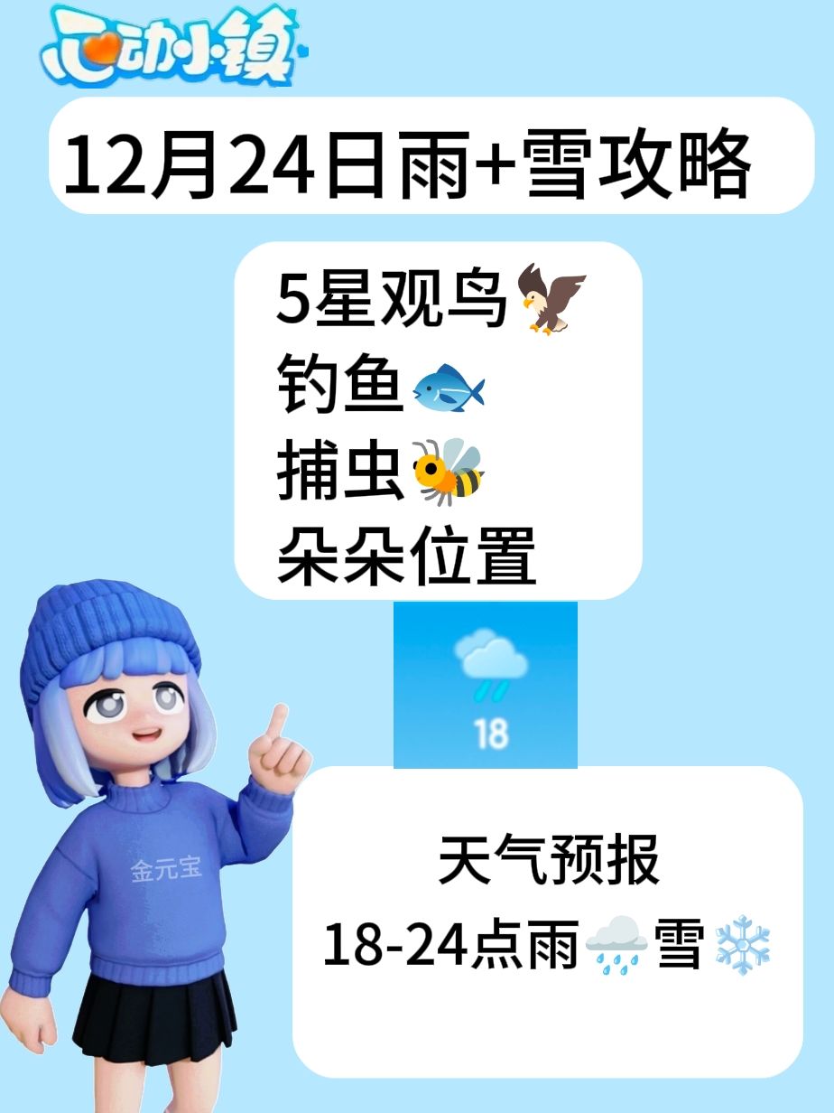 天气预报 18-24点雨🌧️雪❄️ —————— 5星观鸟🦅 钓鱼🐟 捕虫🐝 朵朵位置 ~~~~~~~~~~~ 天气显示下雨时,雨天朵朵才会出现。晚上6点之后再去找朵朵。 #心动小镇攻略征集 #心动小镇 #心动小镇线条小狗联动 #线条小狗在小镇