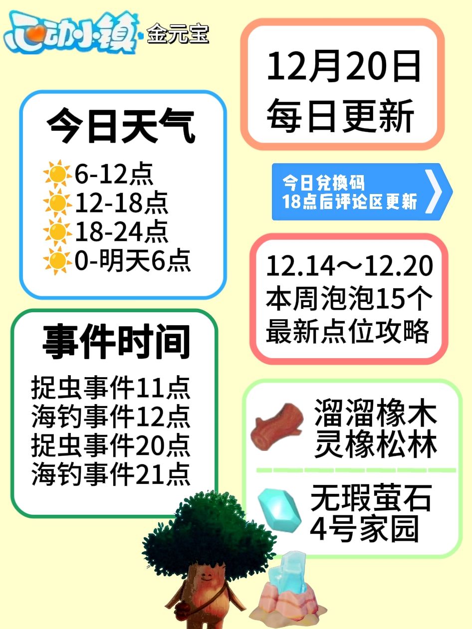 每日更新! 溜溜橡木 灵橡松林 无瑕萤石4号家园 —————— 兑换码晚上18后评论区更新 —————— 今日天气 6-12点晴天☀️ 12-18点晴天☀️ 18-24点晴天☀️ 0-明天6点晴天☀️ —————— 事件时间 捉虫事件11点 海钓事件12点 捉虫事件20点 海钓事件21点 —————————— 12.14~12.20本周泡泡15个最新点位攻略 #心动小镇 #心动小镇攻略