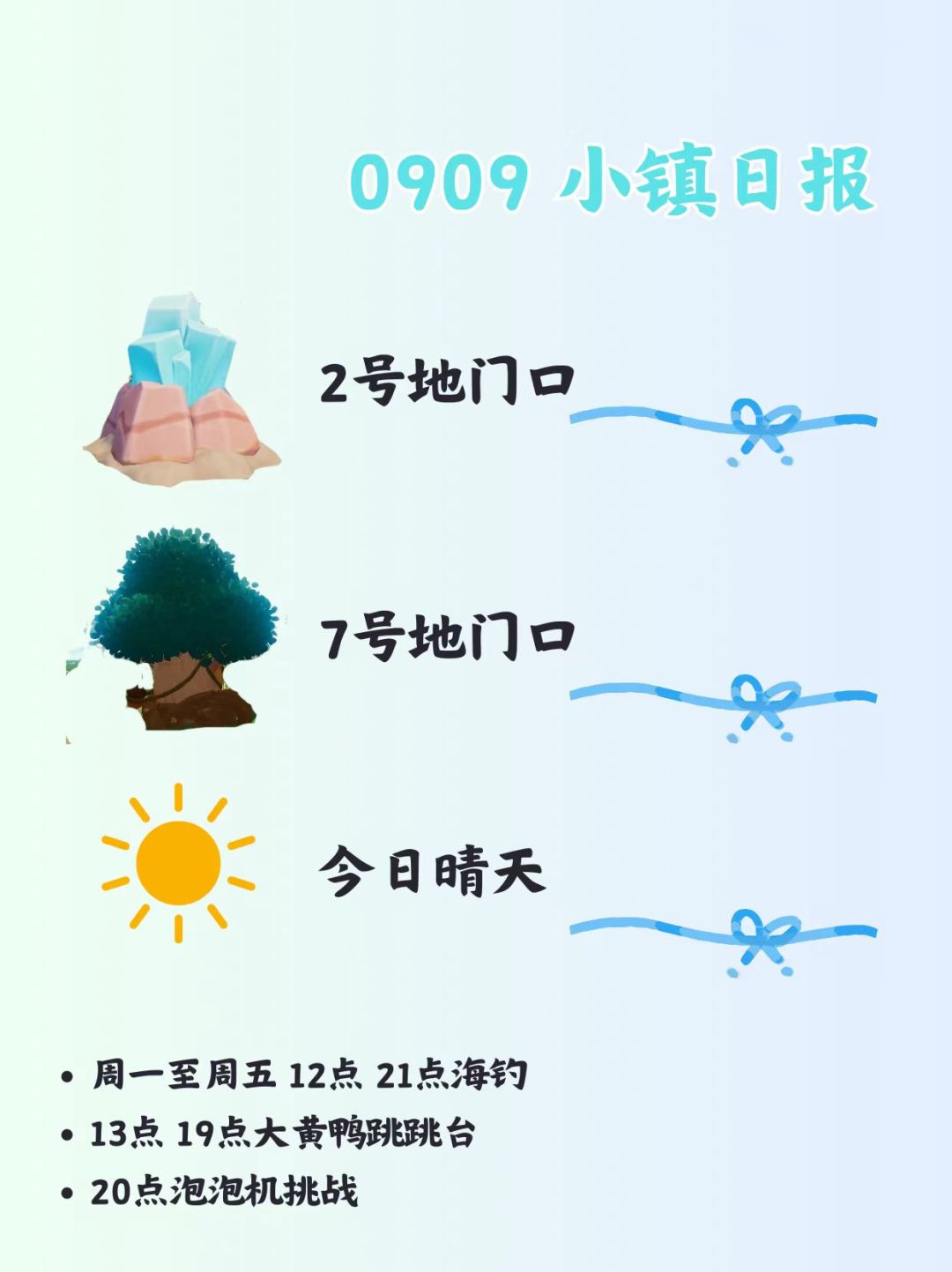 今日小镇tips:1.今日小镇溜溜橡木在7号地,萤石在2号地门口 2.周一至周五 12点、21点海钓,13点、19点大黄鸭跳跳台,20点泡泡机挑战 #心动小镇 #心动小镇创作计划 #沙滩乐园季创作计划 #心动小镇攻略