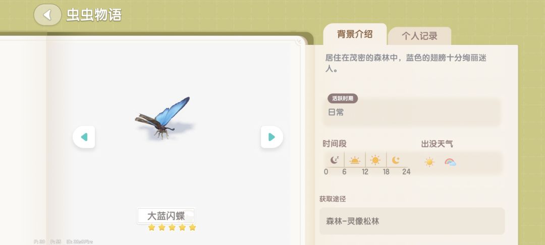 此贴为心动小镇wiki计划页面 7级捕虫解锁 森林/灵橡松林 刷新天气 晴/彩虹 刷新时间 6—24 5星所需抓捕数 30 最低判定刷新时间 1分半左右 单次刷新数 1-4 持续警戒消失时间 10秒 刷新媒介 空气/灌木丛/带花灌木/紫花灌木 抓捕策略 无。此虫多出现于下森林湖及周边海滩,不刷新在上部分(存疑,可能是数据量不够) 点位图 粉色为空气墙点位,刷水里,有概率捕获