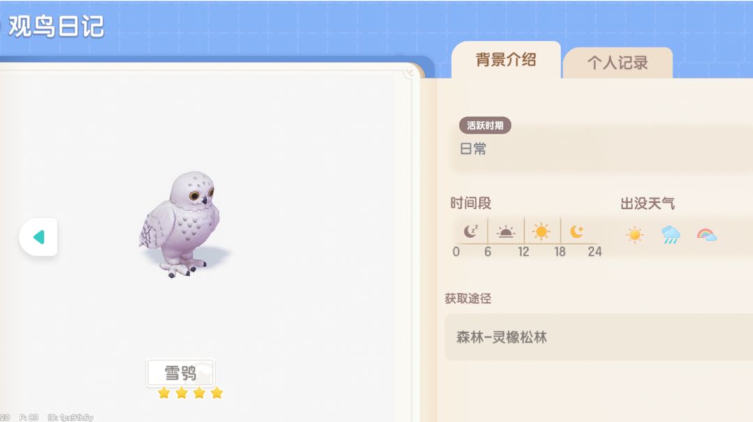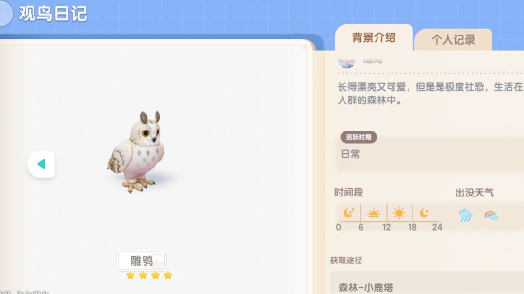 观鸟10级解锁 时间天气 全时间段 雨天/彩虹天出没 地点 森林-小鹿塔 5星动作要求 舒展+完美成像 彩虹天18-24时间段 高刷位置如图(注意雕鸮与长耳鸮一样舒展是180度转头)#心动小镇 #心动小镇攻略 #心动小镇创作计划