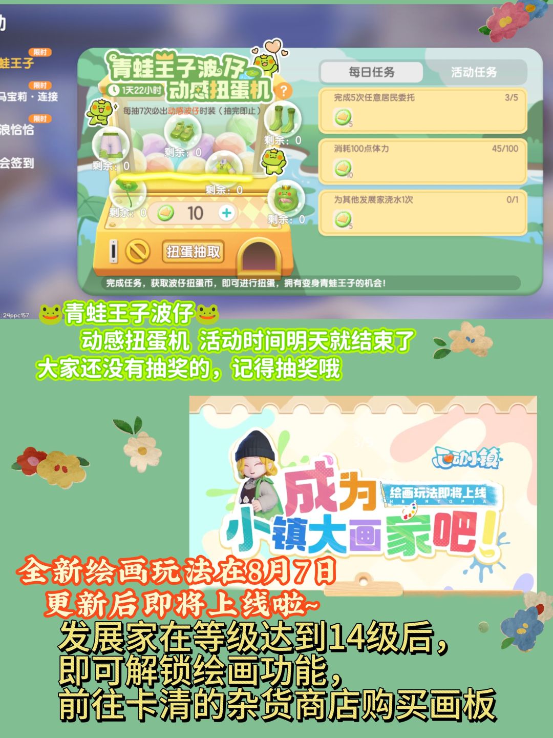 全新绘画玩法在8月7日更新后即将上线啦~ 天气:🌞12:00-18:00酷暑 无瑕莹石8号房前 溜溜橡木10号房前 活动时间表 11:00/20:00引虫出洞 12:00/21:00海钓 14:00黄鸭跳跳台 15:00泡泡机挑战 (限时)✨ 13:00灵能虫分散 17:00百鸟归巢 18:00异壳蟹捕捞 19:00每周六周日音乐会#心动小镇 #小马宝莉心动小镇周年联动 #心动小镇创作计划 #心动