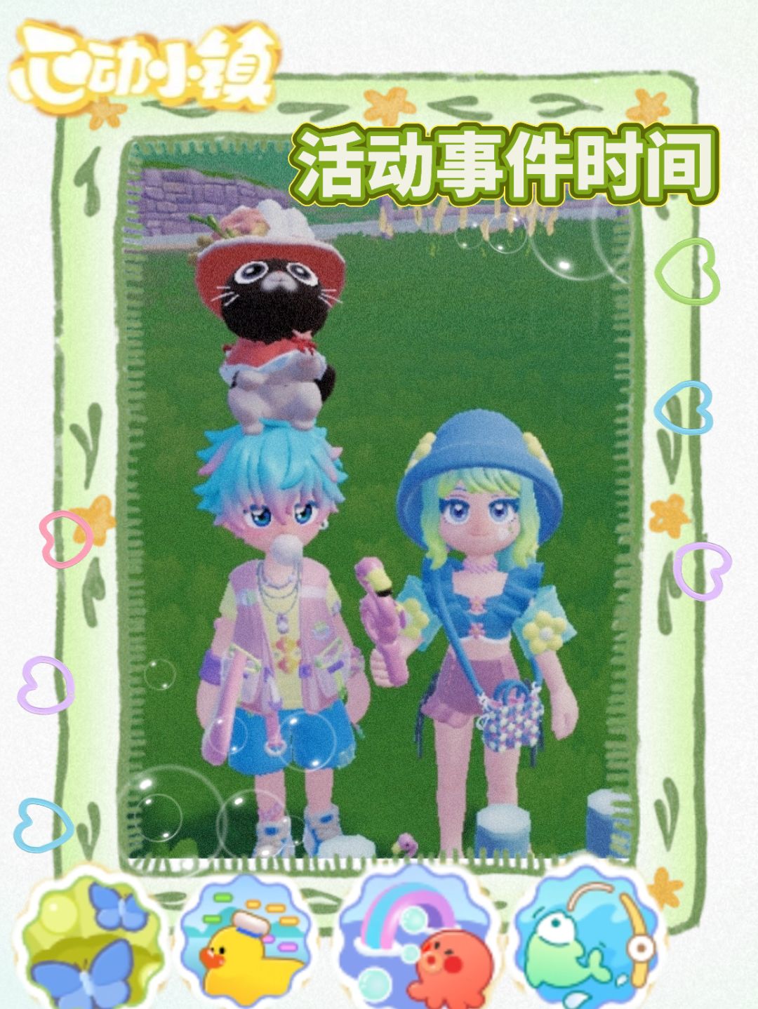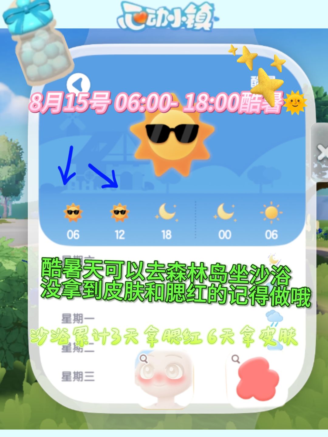 天气:🌞酷暑12:00-18:00 无瑕莹石4号房前 溜溜橡木1号房前 活动时间表 11:00/20:00引虫出洞 12:00/21:00海钓 14:00黄鸭跳跳台 15:00泡泡机挑战 (限时)✨ 13:00灵能虫分散 17:00百鸟归巢 18:00异壳蟹捕捞 19:00每周六周日音乐会#心动小镇 #小马宝莉心动小镇周年联动 #心动小镇溜溜橡木 #心动小镇酷暑天 #心动小镇创作计划