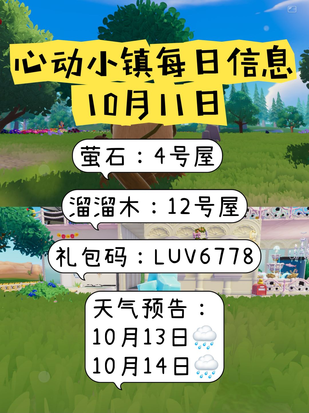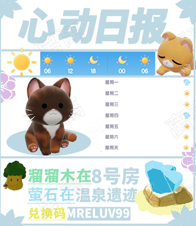 今天的 ⭐溜溜木在8号房⭐ ⭐萤石在温泉山湖遗迹【老家】⭐ 兑换码 MRELUV99 ⭐时间到了直接在评论区复制噢⭐ ⭐10.12-10.19粉色泡泡位置如图⭐ 🐟海钓🐟【12:00-12:10】【 21:00-21:10】 ⭐今天天气⭐ 晴☀ 预计未来七天没有彩虹天🌈 未来七天预计有🌧,可以去文艺街找雨天朵朵买糖果噢 点赞关注❤️持续更新⭐ #心动小镇 #心动小镇创作计划 #心动小镇泡泡 #