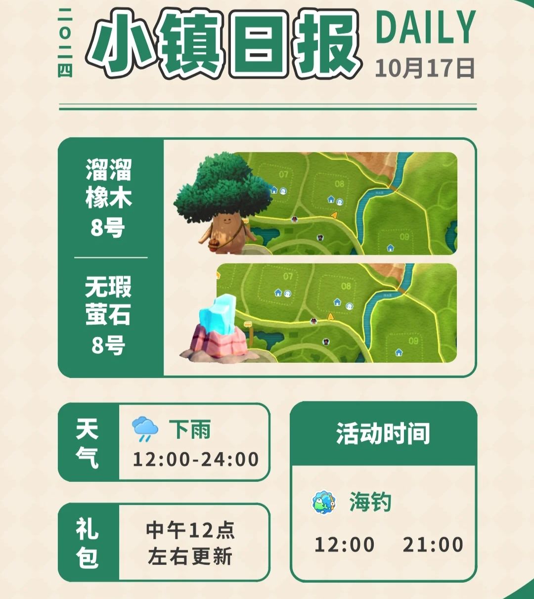心动小镇 每日溜溜木萤石位置,时间表天气 10月17日 下雨12:00-24:00 溜溜木:8号(溜溜橡木) 萤石:8号(无瑕萤石) 时间表 12:00 海钓 21:00 海钓 溜溜木和萤石须知 溜溜橡木和无暇萤石 7级后完成森林星灵任务解锁 当天任务解锁砍过了,不能再砍 第二天再来看位置 溜溜木和萤石为稀有资源 每日必采!且只可采一次 每日早6点更新后可再次采集 随机出现在居