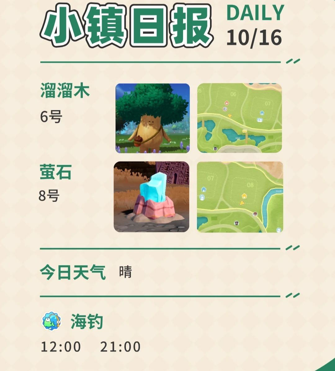 心动小镇 10月16日 溜溜木萤石,时间表天气 10月16日 溜溜木:6号(溜溜橡木) 萤石:8号(无瑕萤石) 时间表 12:00 海钓 21:00 海钓 [向右R]溜溜木和萤石须知 溜溜橡木和无暇萤石 7级后完成森林星灵任务解锁 当天任务解锁砍过了,不能再砍 第二天再来看位置 溜溜木和萤石为稀有资源 每日必采!且只可采一次 每日早6点更新后可再次采集 随机出现在居民区和老家 每日