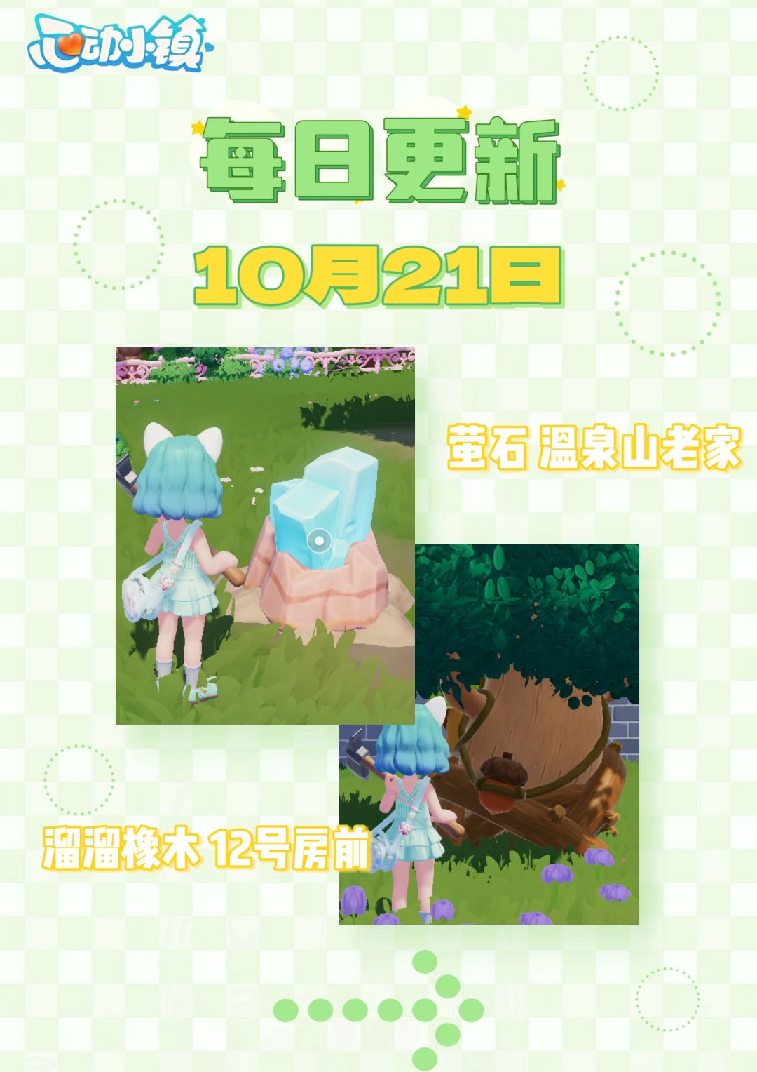 💎萤石位置:温泉山老家 🪵溜溜橡木位置:12号房前 🌤️天气:晴天 #心动小镇 #心动小镇创作计划 #小镇奇灵夜季 #奇灵夜季攻略征集 #心动小镇兑换码