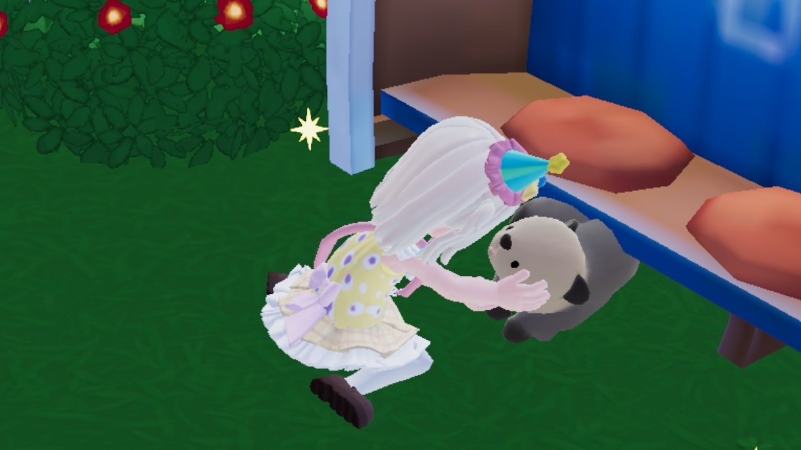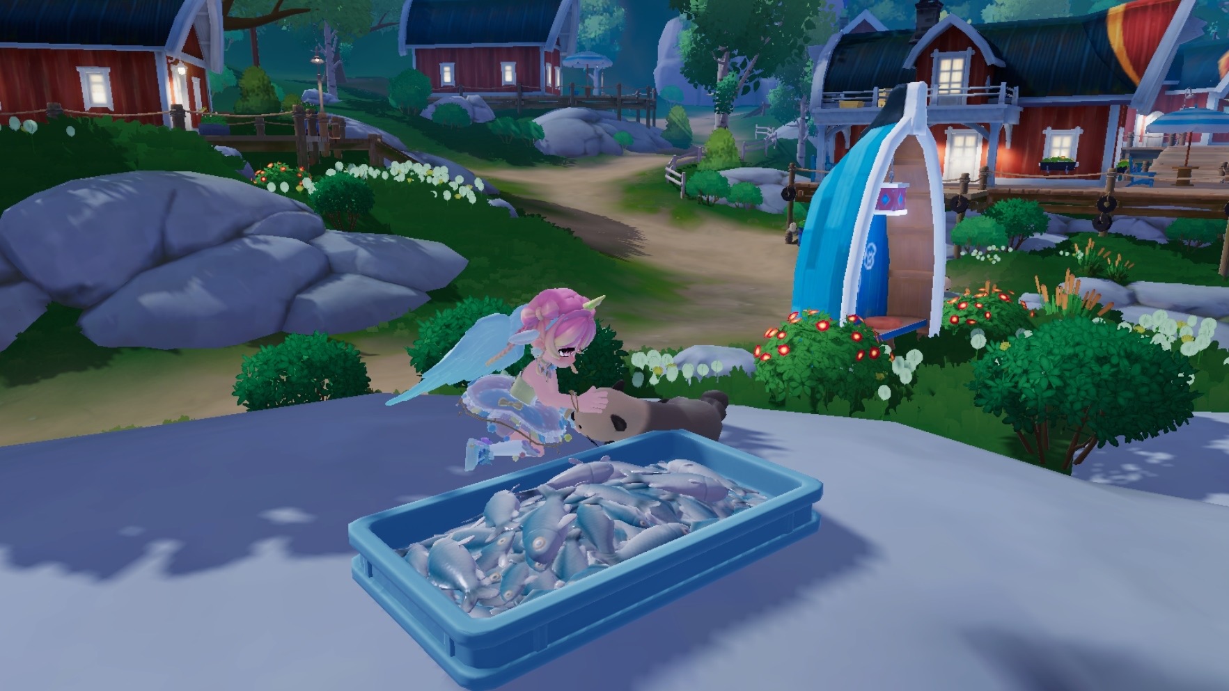 食槽:渔村广场-半只船前的石头上 食物:海虾、青虾、贻贝 天气:雨天、彩虹天
