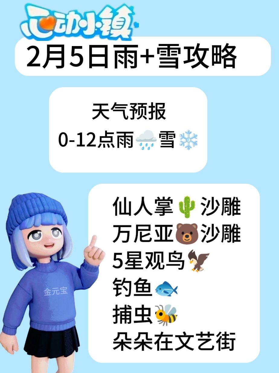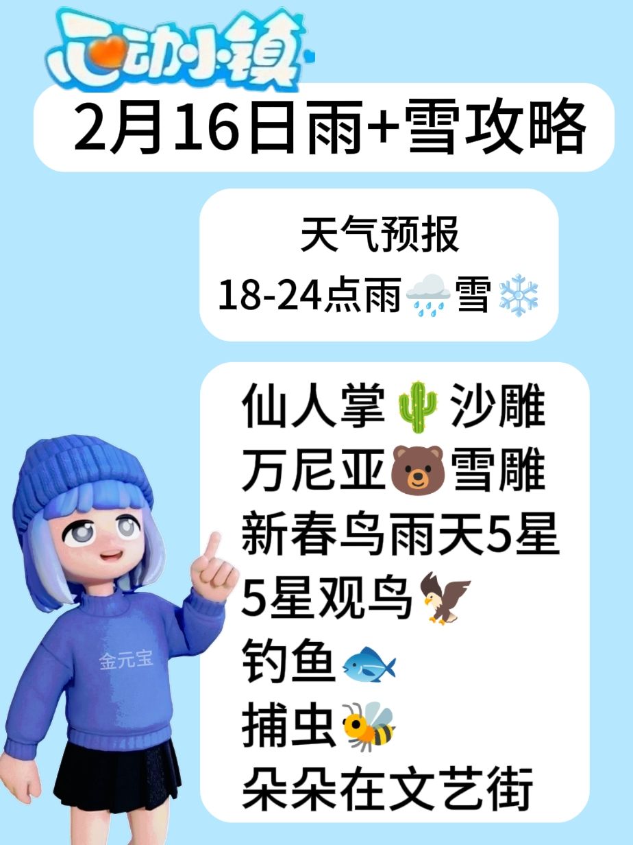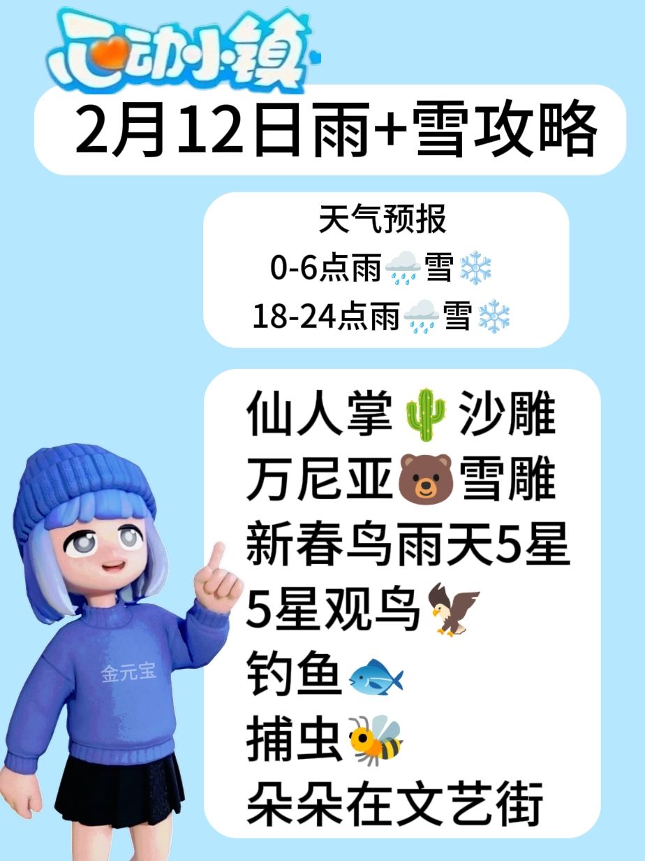 天气预报 明天周三的0-12点雨天下雪 ———————— 5星观鸟🦅 钓鱼🐟 捕虫🐝 朵朵在文艺街 ———————————— 雪雕注意天气: 安妮☀️🌈 万尼亚🌧️🌈 沙雕注意天气: 仙人掌🌧️🌈 肌肉猫🌈 其他沙雕全部天气 ———————— 11-12级鱼虫鸟(评论区) #心动小镇 #心动小镇创作计划 #心动小镇新春季 #新春季攻略征集 #资讯评论员 #游戏种草计划 #今天游戏圈发生了啥