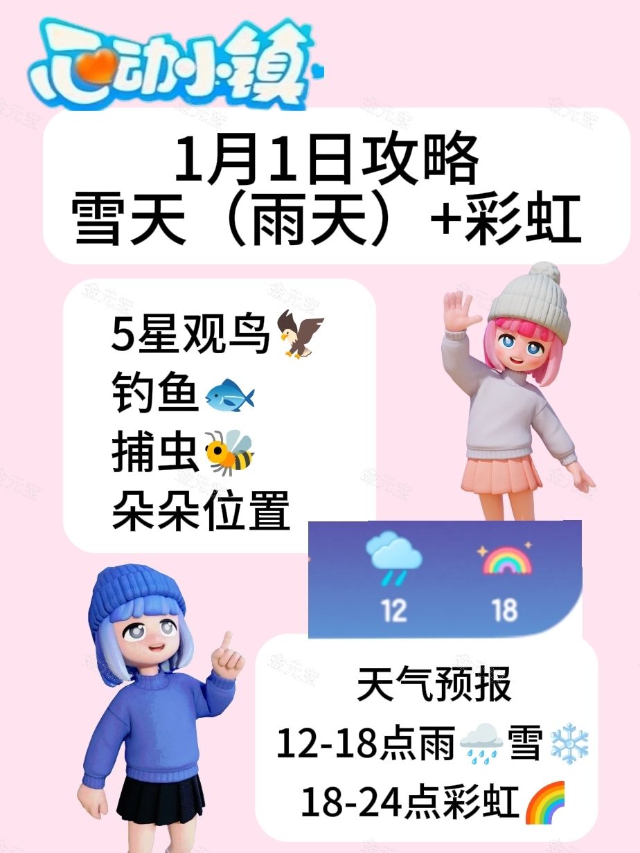 连续2天彩虹天(12.31号和1.1号)的天气一样 ———————— 天气预报 12-18点雨天🌧️ 18-24点彩虹🌈 ———————————— 5星观鸟🦅 钓鱼🐟 捕虫🐝 朵朵位置:今天彩虹朵朵在市中心 —————————— ❄️雪天和雪景规律 天气预报有雨🌧️的那天, 就算那天一开始是晴天☀️ 整天地上也有积雪。 现在的雪天❄️是雨天🌧️变的, 只有空中飘雪❄️才是雪天(雨天)。 🌧️雨天