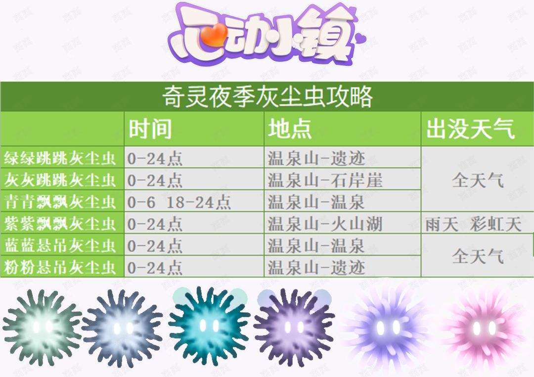 灰尘虫全图鉴 除了紫紫飘飘是雨天彩虹天出没,其他都是全天气 有不懂的可以问噢[表情_开心][表情_开心] 如果有帮到你不妨点个赞❤[表情_开心] #心动小镇 #小镇奇灵夜季 #心动小镇攻略 #游戏推荐 #游戏讨论 #奇灵夜季攻略征集 #心动小镇日常 #奇灵夜季