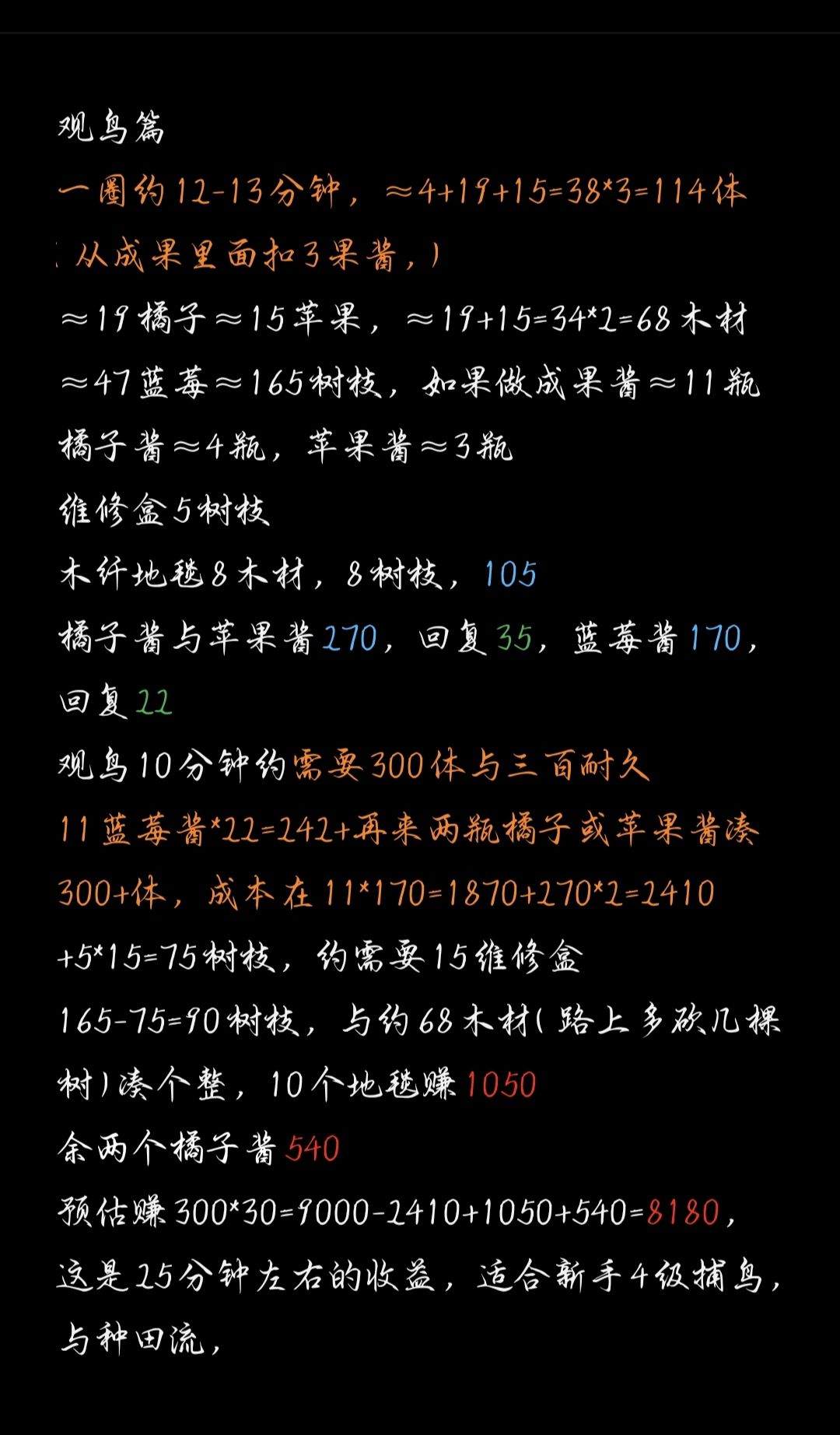 新手赚钱方法: 1. 跑图路线:围着居民区跑图,这里包含多数果树和浆果丛,收益较高,遇到芭蕉树也可砍伐获得优质木材,记得定期检查果树是否重新生长以便及时采集 2. 高效跑图:攒钱先买电动车,有电动车后可跑环镇公路。准备蓝莓果酱并在家种植番茄,沿路砍果树、捡浆果、拍鸟、抓虫,约15分钟回家收菜,循环此过程 3. 烹饪推荐:食物星级不同价格不同,将水果加工成果酱后售价更高。前期推荐制作蓝莓果酱,可