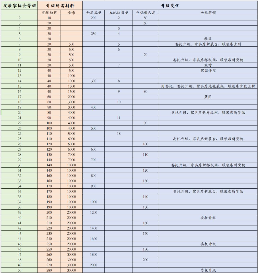 发展家协会,相当于心动小镇的游戏等级系统,通过提升等级能够解锁相应的功能,以及提高仓库容量、土地块数量、斧镐耐久度等上限,能够方便我们体验更多新内容。 为了让萌新玩家能够更直观的体验提升等级的材料,及其带来的收益,这里列出一张图表,希望大家对照观看使用。 等级注意点: 1.主线任务,支线任务,居民委托,是获取贡献勋章(升级等级经验)的重要来源,特别是居民委托,每天有5个,一定要做满。 2.等级24