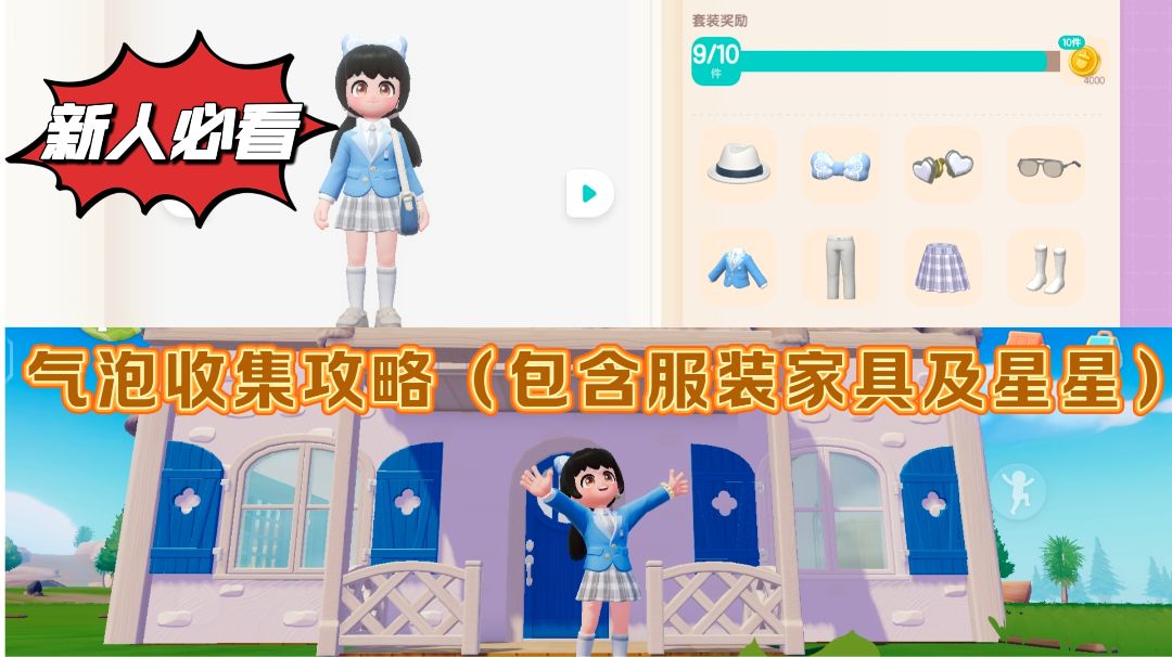 关于气泡首先要明白在游戏中一共存在三种不同的气泡,颜色品质分别是蓝色,紫色和金色,蓝色品质主要提供额外的加成状态效果(俗称的增益buff),每隔一段时间会刷新;紫色品质气泡随机产出家具、材料、等(给的东西不重要,实在想全部收集,可在下方回复,根据人数需求会考虑出一份紫色气泡收集);金色品质气泡包含简单学院风的套装服饰和部分制作配方 红色数字位置是简单学院风套装部件气泡位置 紫色则是满愿星和配方气泡