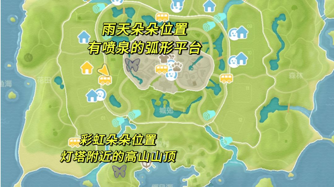 1.部分鱼/虫需要特殊天气获得,天气可以通过手表内的天气预报得知。彩虹天气会有彩虹泡泡,外观为四色四叶草,顶泡泡可以得到一次性道具彩虹花束(效果可作用于站在你身边的人),使用效果为30分钟的概率提升获得物品星级/产量。特殊天气会出现朵朵,与她对话进入商店可以购买彩虹糖(金币)、浮云卷配方(许愿星)以及明信片(金币)。 2.对别人/别人对你使用拍手动作可以获得buff加成,提高移动速度的同时恢复体力