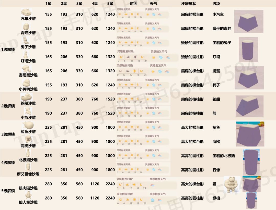 2024.8.22 已更新肌肉猫数据 2024.8.16 已更新仙人掌数据 以下为8.11版本 如题,沙雕价格、时间段与天气适用于公测版本(2024.8.10开始的潮流季) [表情_举手]三个选项与沙雕名称并不一定一致,因此补充在表上 [表情_猫咪举手]沙雕制作完美攻略可参考: 沙雕爱好入门详细攻略 https://www.taptap.cn/moment/571265274108448721?s