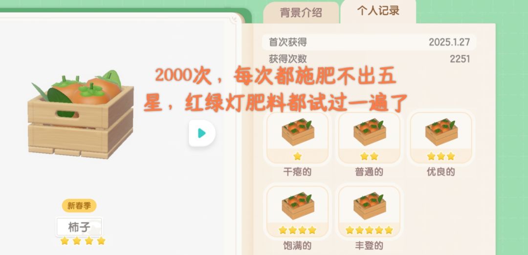 恶心人的策划,施肥才能出五星,五星概率又极低,肥料设上限 以前五星概率没这么低,参考前不久没改之前的葡萄大帝,刚出时候应该是没改参数,当天很多人五星 现在园艺十级就是填坑,不撒两三千的肥料出不来五星。满浇水,除草,毫无用处。 或者就是杀熟机制,活跃度高的玩家故意卡你进度 策划,祝你买菜必涨价[表情_菜] #心动小镇 #心动小镇攻略 #心动小镇新春季 #心动小镇创作计划 #小心动小镇创作家激