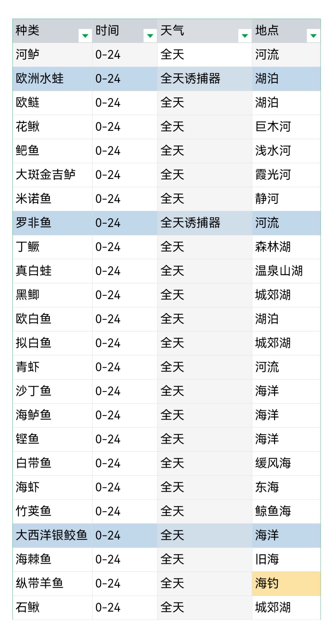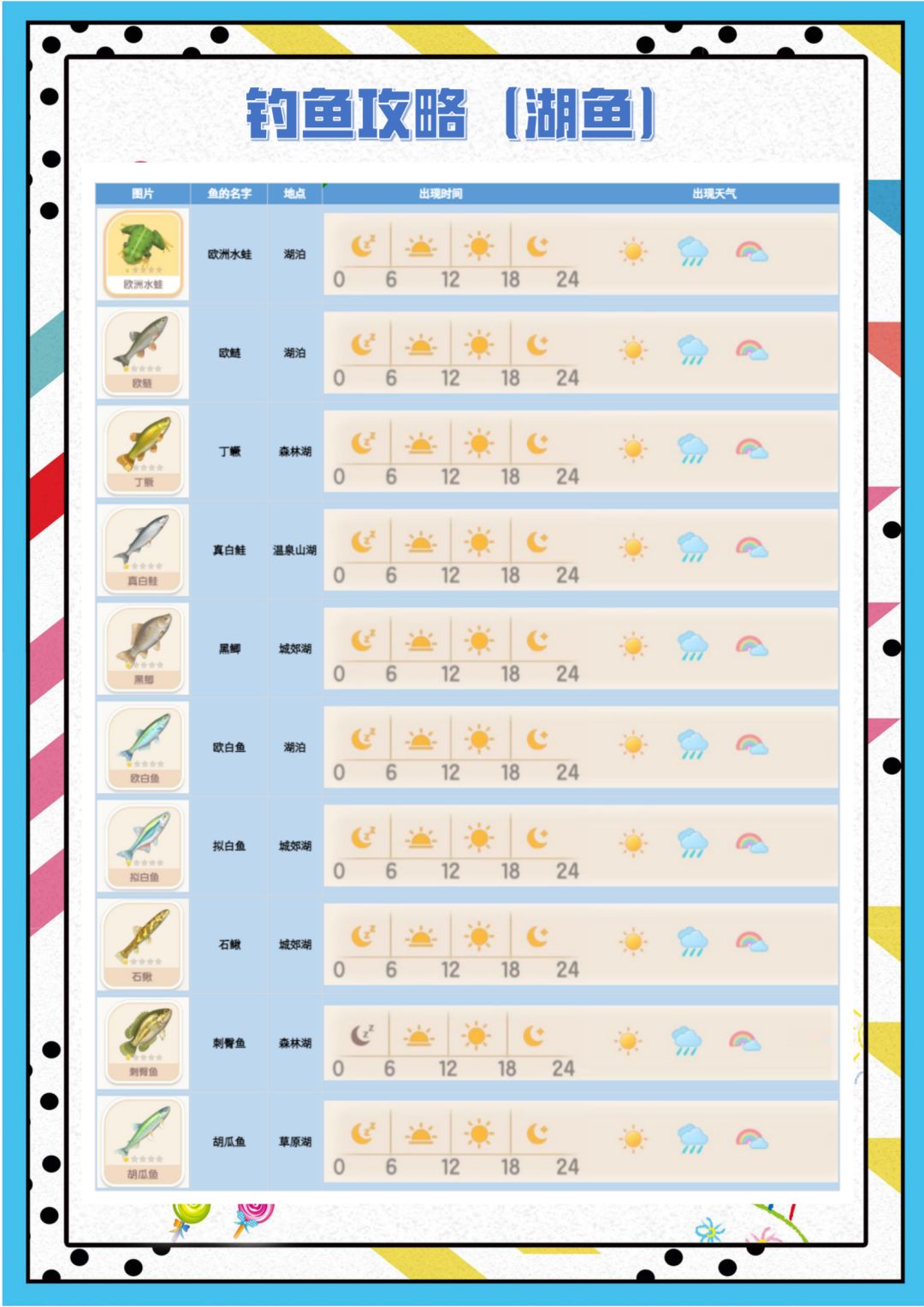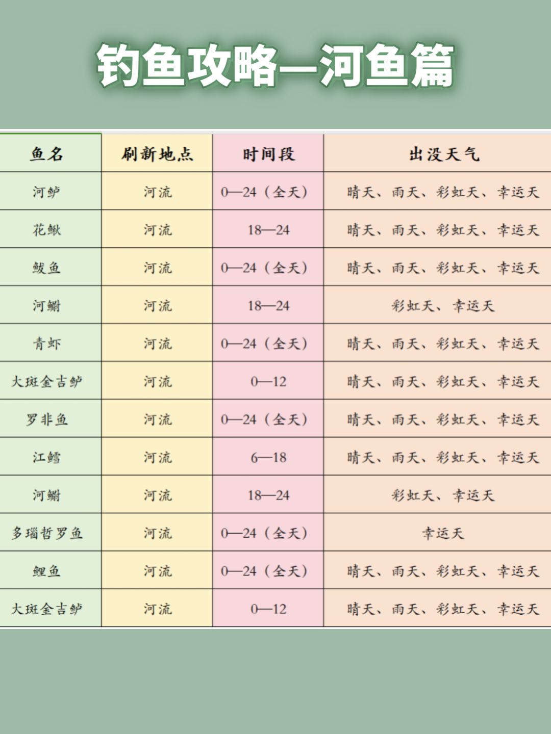 晴天下午/晚上:霞光河 雨天:浅水河 彩虹天:温泉山湖、旧海、缓风海-海钓 上午彩虹天:东海 下午彩虹天:静河、巨木河、鲸鱼海 晚上彩虹天:草原湖、森林湖、城郊湖 根据天气直奔对应水域去钓。 详细攻略在后图,力求一次出完同一片水域全部鱼的五星。 #攻略 #钓鱼 #图鉴
