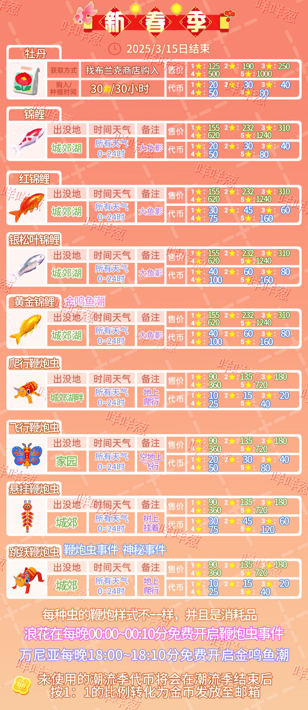 食谱与隐藏食谱,还有代币的售价 鲜肉饺子、黄金蛋饺、清炖瓦罐汤、番茄瓦罐汤、海鲜瓦罐汤食谱与代币 各种锦鲤的出没地 锦鲤、红锦鲤、银松叶锦鲤、黄金锦鲤 鞭炮虫刷新点位攻略,只找到了这么多应该会有些漏缺 飞行鞭炮虫大概一个区域只刷三只 鞭炮虫可以放鞭炮哦,快来试试吧 爬行鞭炮虫、飞行鞭炮虫、悬挂鞭炮虫、跳跃鞭炮虫 第三周鸟类爱好解锁 鸳鸯、喜鹊、红腹锦鸡、丹顶鹤的出没地与价格表 第四周鞭炮虫事件解锁