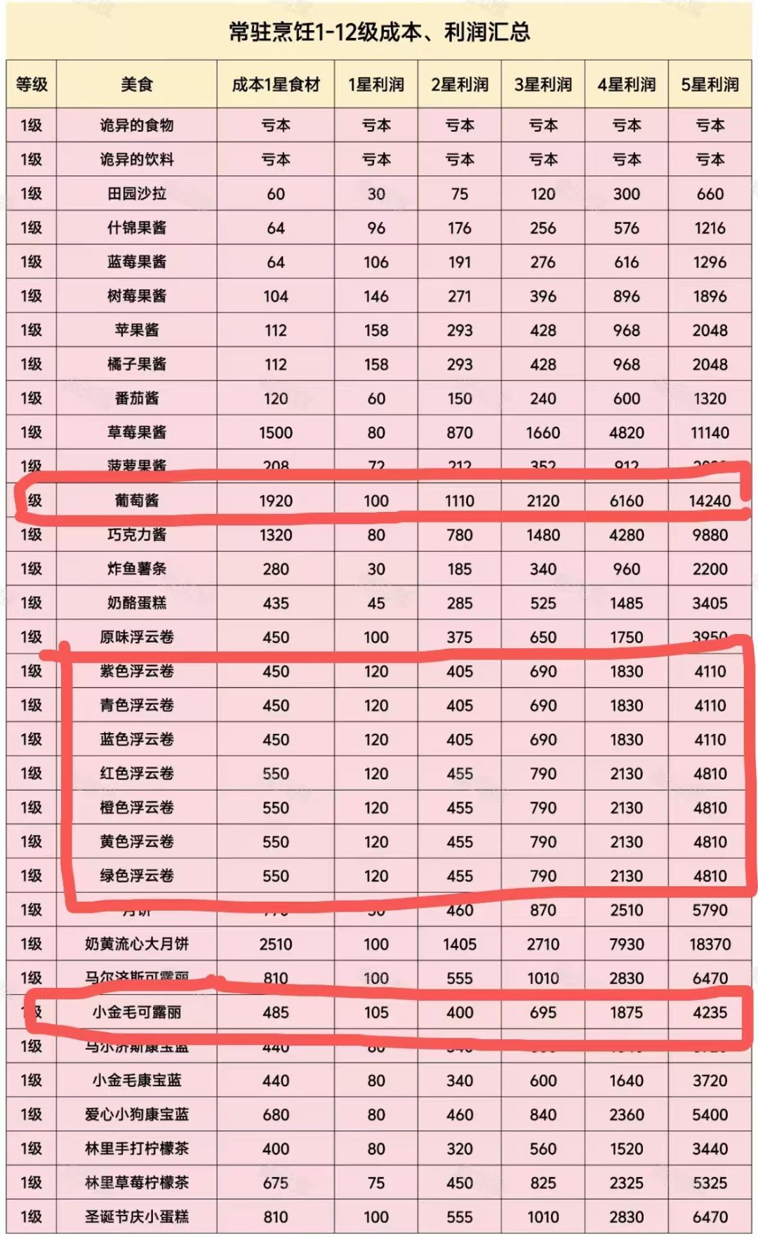 2星产品售价是1星的1.5倍,3星是1星的两倍,4星是3星的两倍,5星按4星的两倍算 成本计算方法: (商人处成品一星卖价)番茄50 土豆120 小麦380 生菜580 菠萝72 胡萝卜190 (按厨师售价)肉200 鸡蛋100 牛奶和咖啡50 黄油150 糖果150 提拉米苏450 鱼50 北欧鳌虾100 玉米和草莓的一星售价还不清楚 利润=卖价-成本(不含园艺利润) 如果计算有误,欢迎指正#小镇种草达人