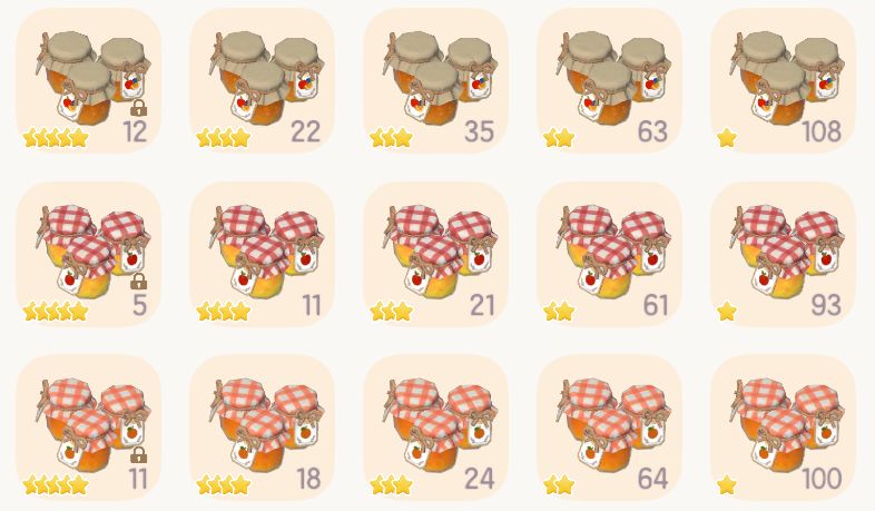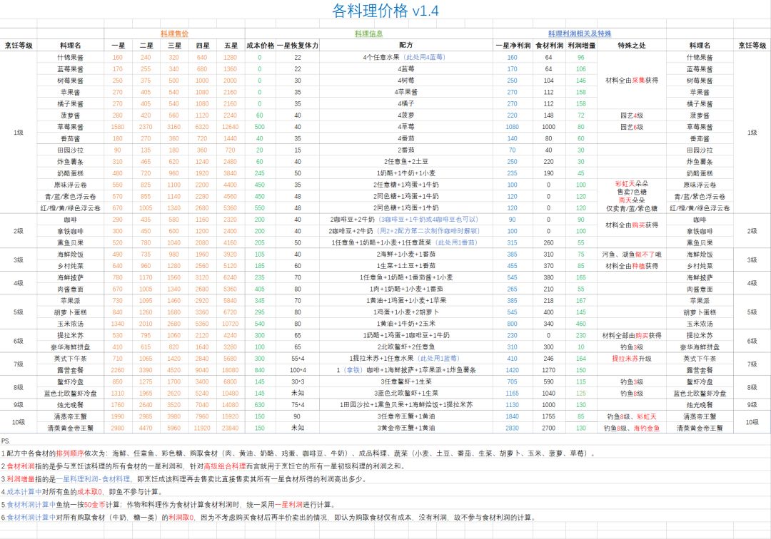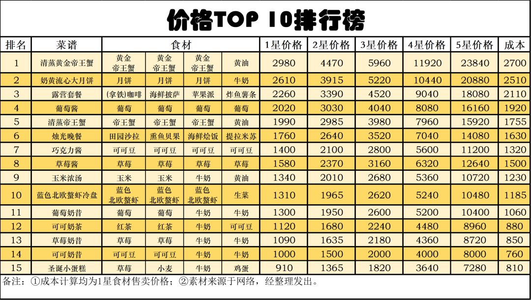注:欢迎各位小镇友友传播分享,禁止任何商业用途的搬运! 家人们,肝了一天终于赶在捉虫服结束之前出来啦!烹饪作为最挣钱的爱好不容小觑! 重要tips总结: 1.做什锦果酱用蓝莓最划算,但是有条件还是做蓝莓酱挣得多一些 2.有条件的话做海鲜披萨最划算,一道菜最低就能挣330,没条件果酱就不错 3.高星作物未必出高星菜,具体每个菜最多使用几星食材不会亏本都在上面表格里了,记不住的一星做菜其他卖掉 4.奶