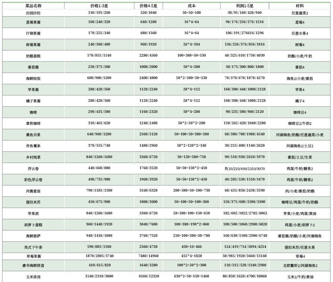 【心动小镇烹饪利润价格表】6级图鉴1-5星