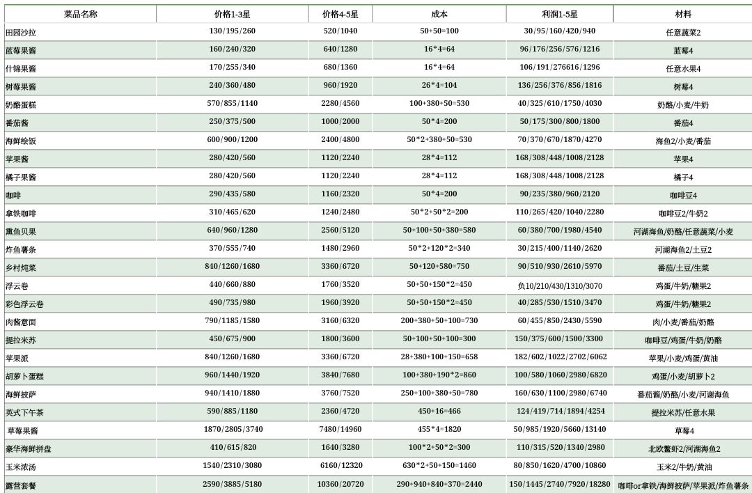 烹饪厨师厨子炒菜做饭食物价格利润图鉴表/搭配推荐