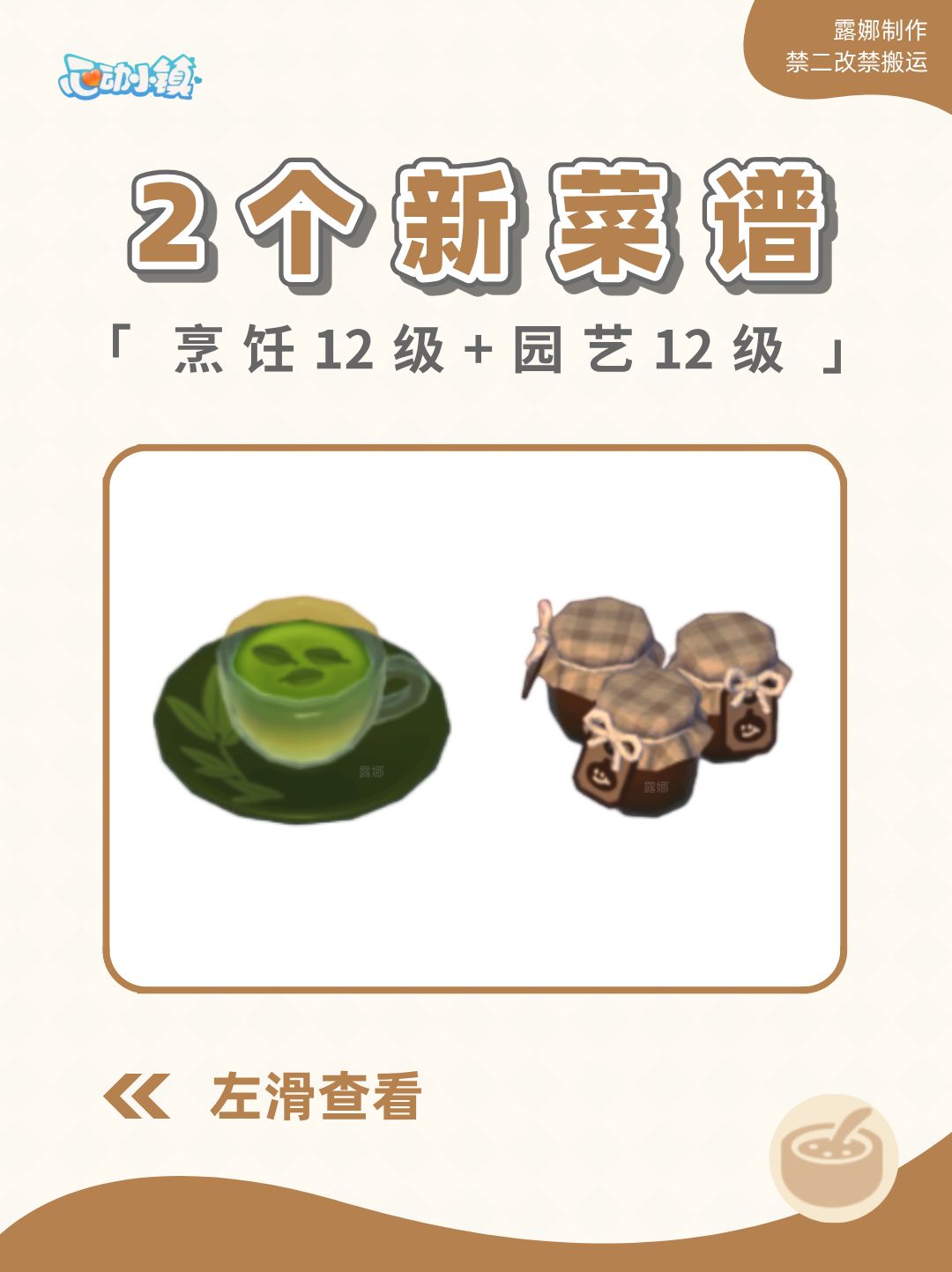 注意:以下菜谱一人只能先解锁一个 目前开服玩家只有2个高级升级券 建议选择自己喜欢的先解锁 烹饪12级:清新绿茶饮 园艺12级:巧克力酱 烹饪11级+园艺11级,暂无 售价待更新~欢迎宝宝们投稿 #心动小镇 #小镇奇灵夜季 #奇灵夜季攻略征集 #心动小镇攻略 #游戏日常