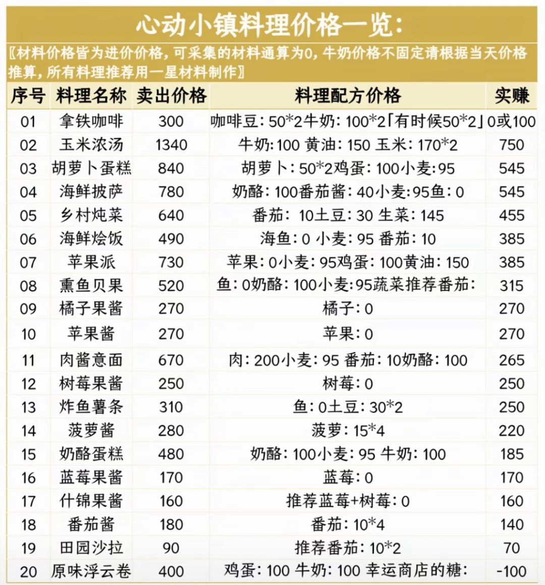 正式服 1.更正了成本计算方式。 2.更正了利润计算。 3.七级烹饪,535份菜倍率为一星价格1.5545±0.12。 4.价格参考性极高,后期不是版本调整基本不修改。 #心动小镇攻略 厨子的前期发展推荐,7厨师7园艺或10厨师8钓鱼 ♥♥♥♥♥♥♥♥♥♥♥♥♥♥♥♥♥♥♥♥♥♥♥♥♥♥♥♥♥ 2025/1/29 延展(以下互不关联) 参考烹饪:10级 参考园艺:10级 I 番茄酱 单份原材:4