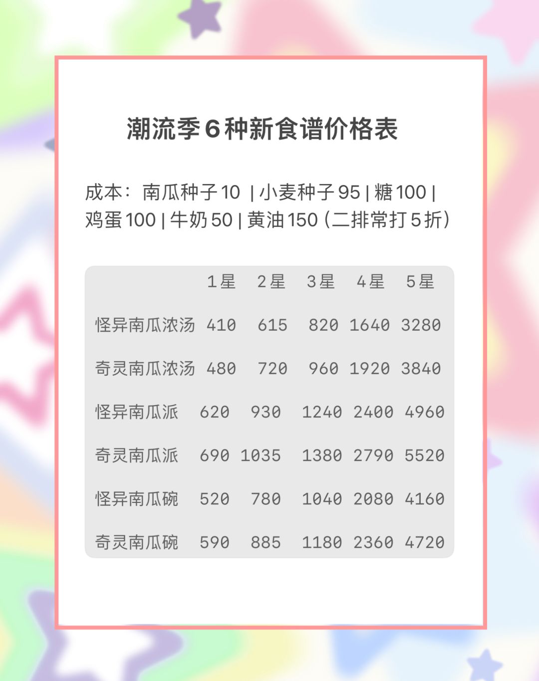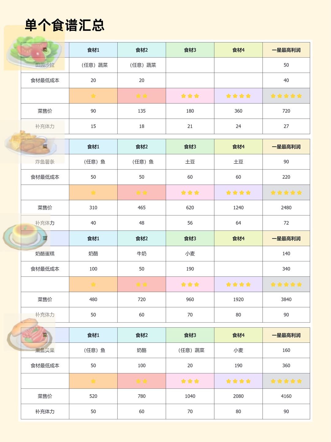 成本价计算采用制作原料在二世处售价。牛奶等需在厨师处购买物品采用二世售价,非原价(太折腾了,不想挨个对[表情_豹哭]) 肝金币建议做椰子水,找俩相邻的潮流季炉子,上锅点一次后就跳另一个锅开煮。 此表所有菜品及原料均为一星。 为标明水果均为蓝莓,鱼均为沙丁鱼。 我这俩库存多[表情_捂脸哭]其他鱼类售价自行找钓鱼赚钱攻略贴 空格处为本人已解锁但没库存的菜品及原料#心动小镇 #心动小镇攻略