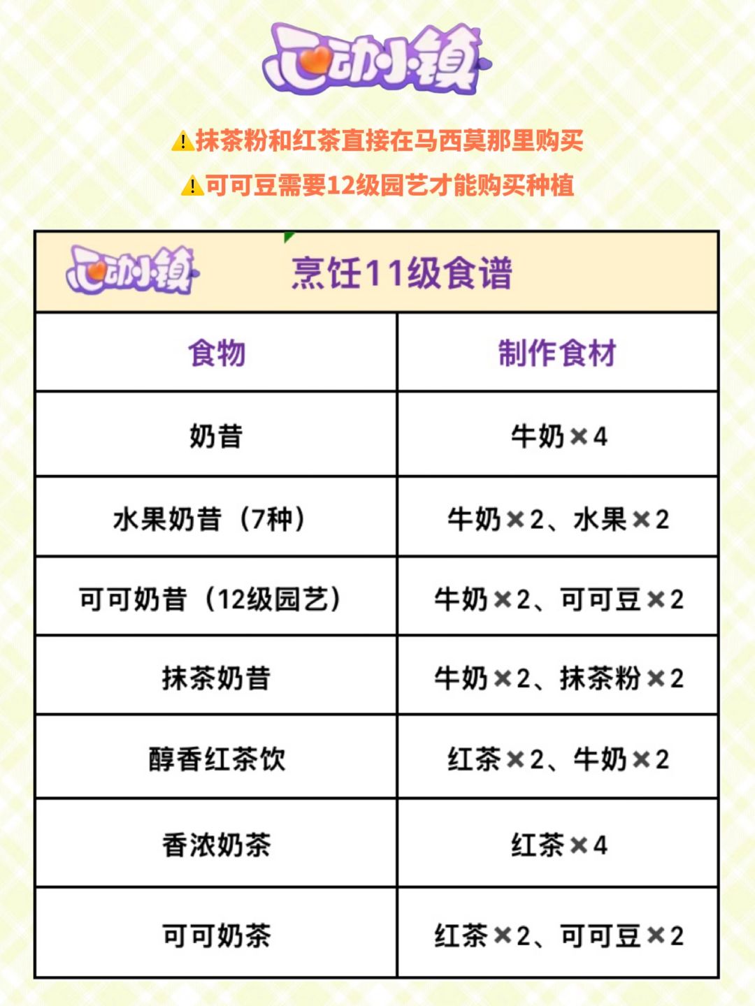 烹饪1-12级所有食谱+往期活动食谱(中秋、柠檬茶、圣诞蛋糕、线条小狗系列、元宵节汤圆)攻略:[表情_比心]https://www.taptap.cn/moment/567390739286199581?utm_medium=share&utm_source=copy&share_id=DBC3ECF5BE2C 园艺1-12级作物花卉价格利润攻略:https://www.taptap.cn/mom
