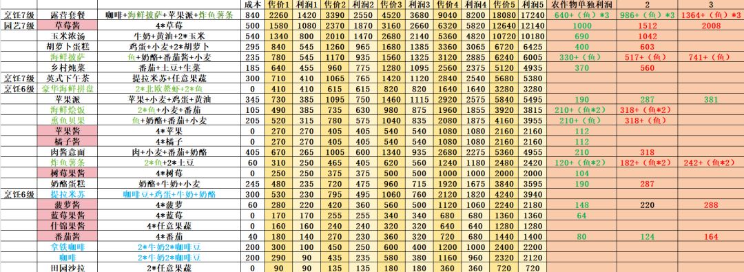 #心动小镇 #心动小镇攻略 #心动小镇攻略征集 [表情_羞涩]园艺等级还是五级,没解锁玉米,就没统计单独玉米的价格。 [表情_加油]农作物单独利润那栏,绿色表示不如做菜,红色表示单独卖划算。我发现做苹果派即使用到三星的小麦依然比单独卖小麦赚的多。 [表情_思考]有鱼的菜品就没有再比较了,鱼还是单卖比较好,每个鱼价格不一样统计起来非常麻烦,也就不知道单独卖做菜材料是不是会比做菜便宜。 [表情_+1]