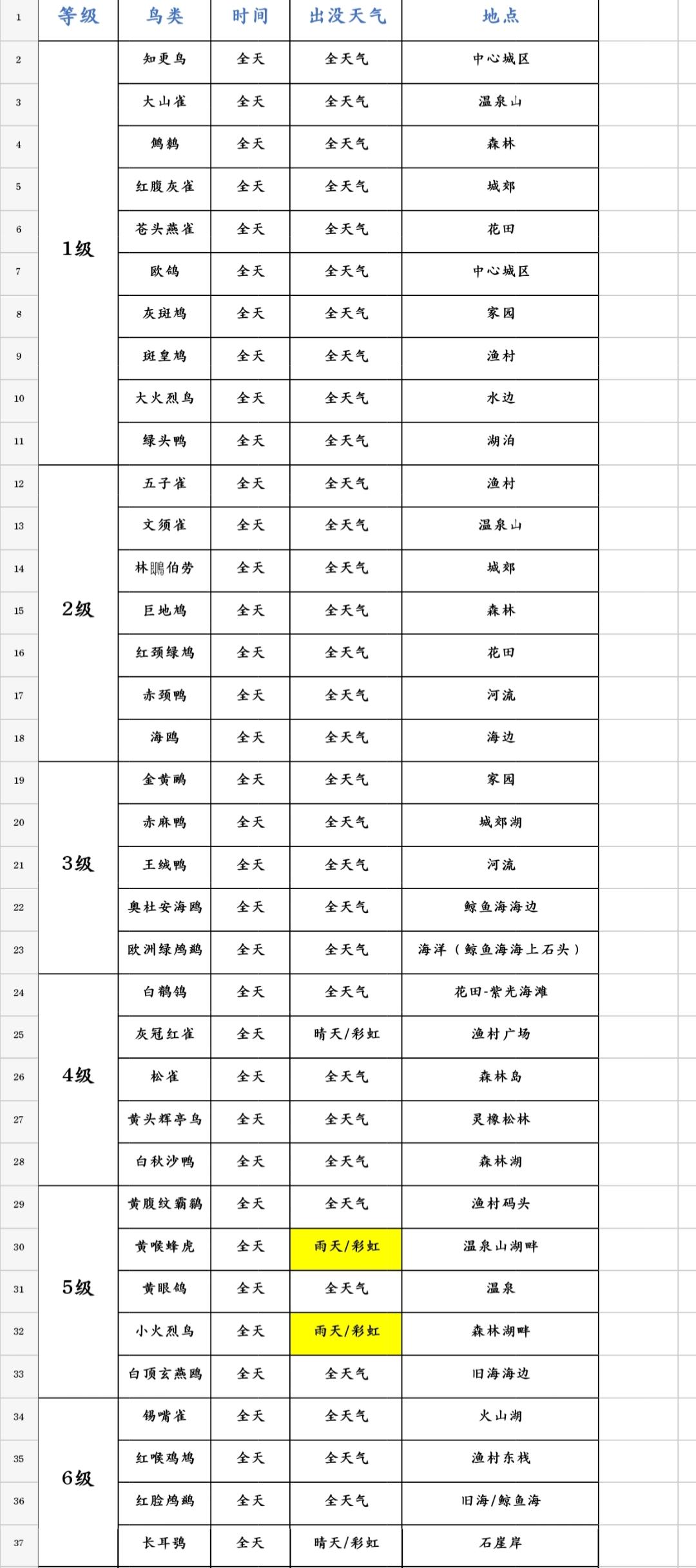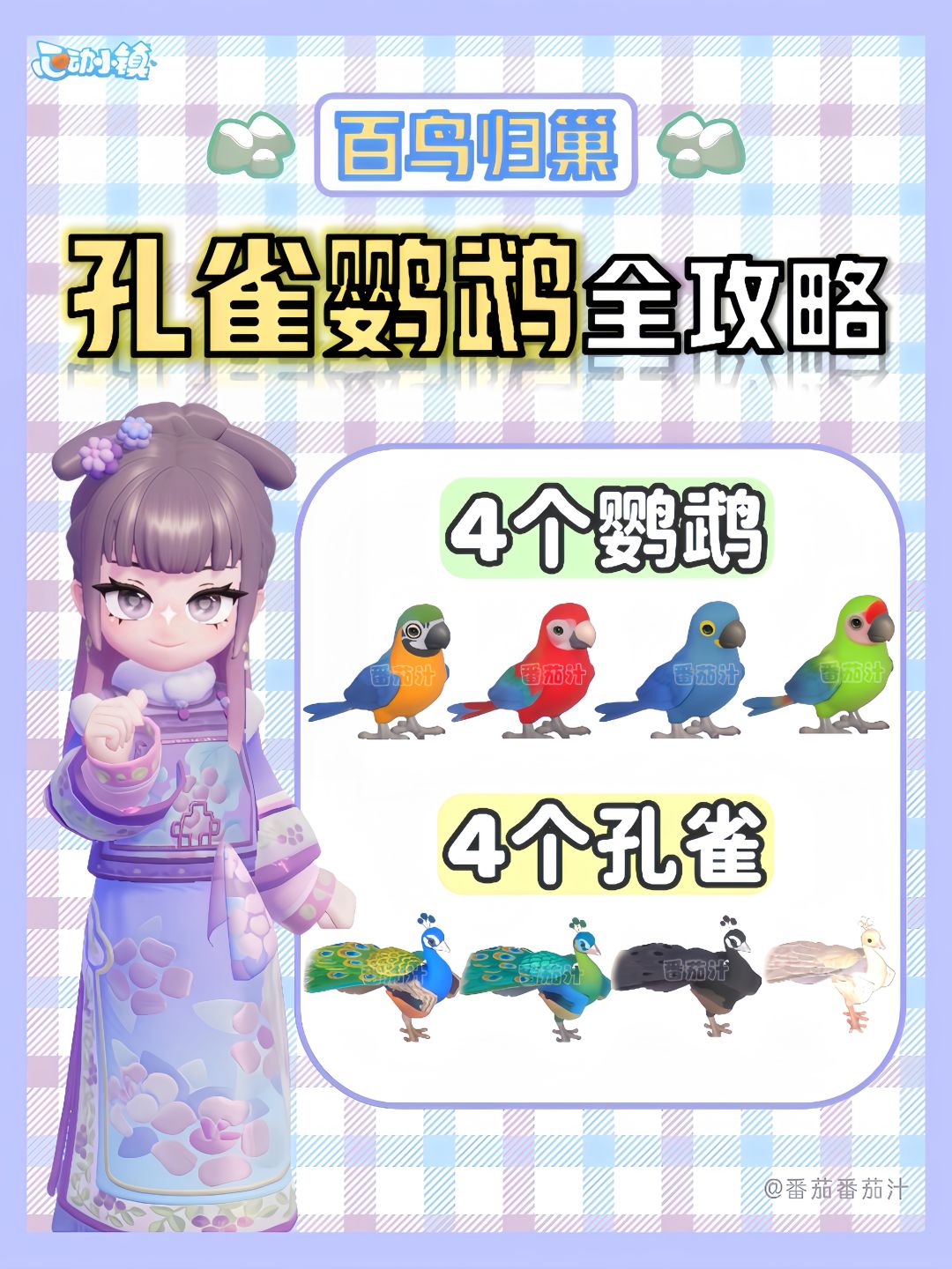 从上到下、从左至右,按照图鉴顺序排列~ 观鸟小tips: 观鸟等级不够、拍到高等级鸟是无效的; 鸟基本全是全天段出现,部分鸟对应天气才会出现,左上角有小星星的,就是有天气限制的鸟,大家稍微注意下哦; 前期需要刷等级,可以对着一只鸟一直拍照,刷观鸟经验; 有些地方要注意观察树,鸟有可能藏在树上; 点个收藏,随时查看更方便[表情_开心]~ #心动小镇 #心动小镇攻略征集