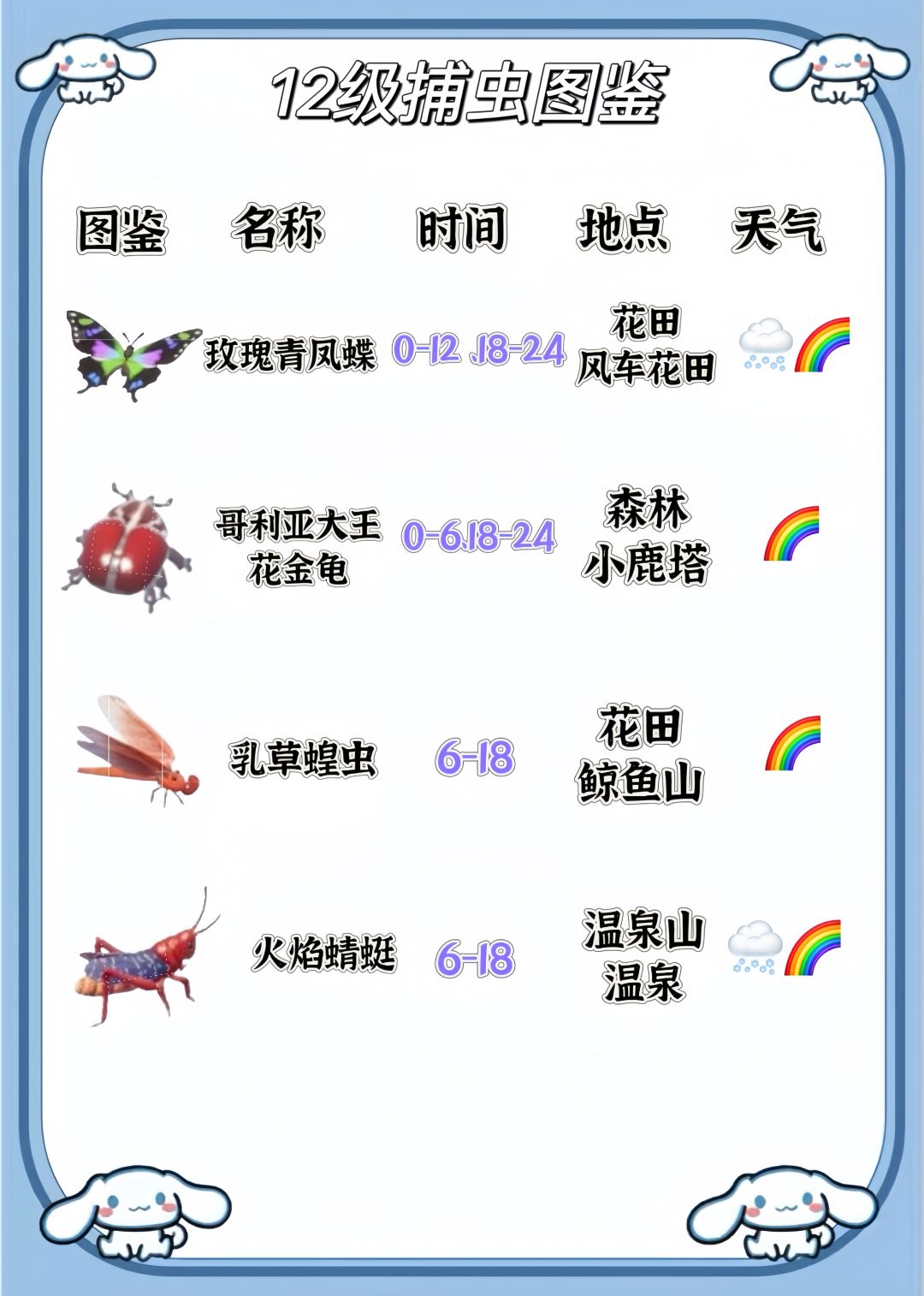 要求:捕虫等级1级 五星:捕虫等级6级 刷五星 ,建议找浪花开玩具虫事件 买全知强化剂(浪花捕虫商店),效率翻倍 (都是全天气全时间) 气球蛱蝶 渔村广场 地上/花丛/草丛 气球凤蝶 风车花田 草丛/花丛 气球闪蝶 城郊 地面/花丛/草丛 发条红星瓢虫 温泉山遗迹 地/花草尖上 发条黄星瓢虫 温泉山火山湖 地/花草尖上 发条白星瓢虫 森林小鹿塔 地/花草尖上 发条金星瓢虫 玩具虫