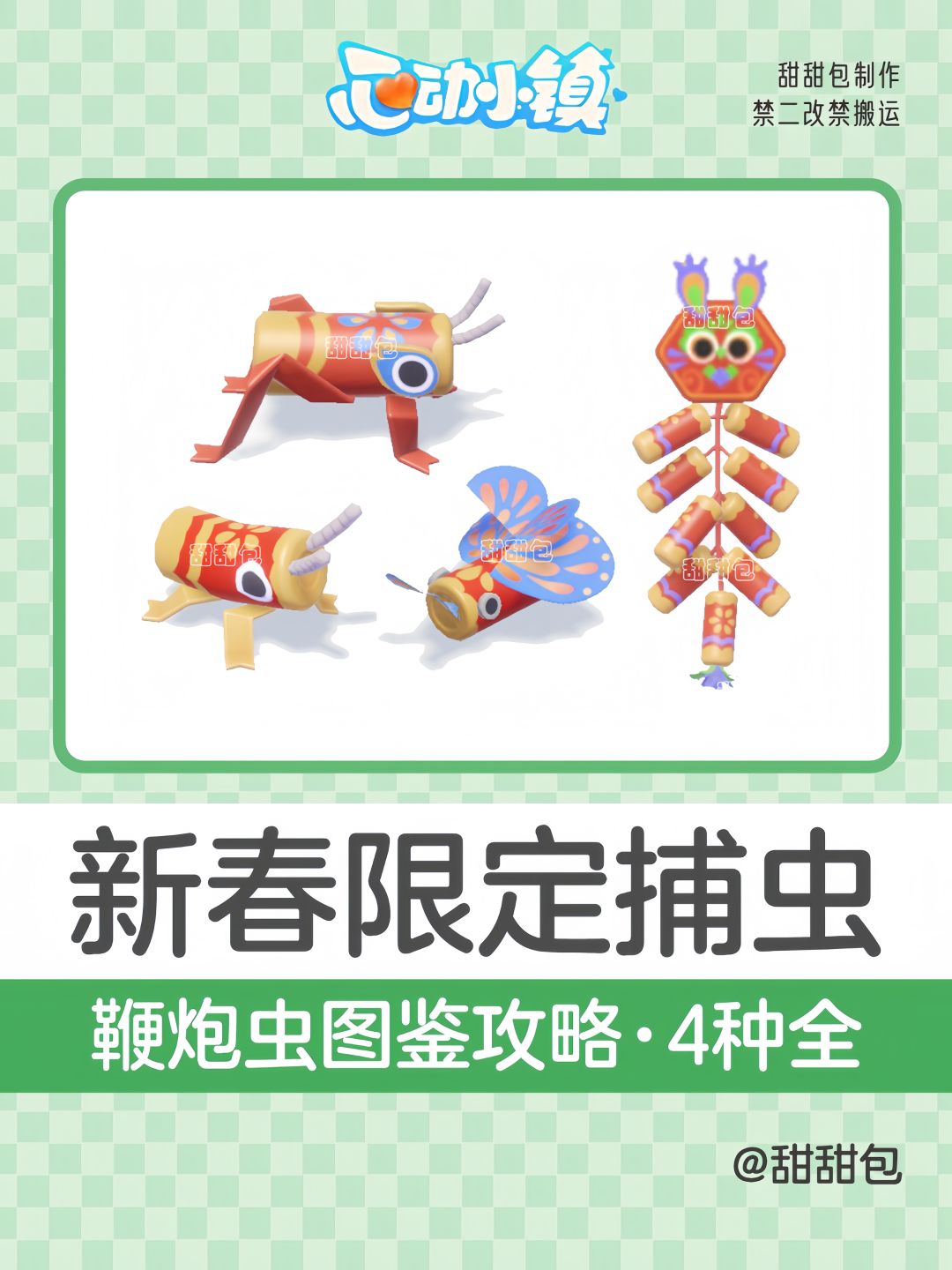 爬行鞭炮虫 白天会出现 晴天会出现 地点推测是城郊 —————————————— 跳跃鞭炮虫 白天会出现 晴天会出现 地点推测是城郊 —————————— 2月1日开放昆虫:爬行鞭炮虫、飞行鞭炮虫、悬挂鞭炮虫、跳跃鞭炮虫。 特殊的昆虫,参加后续开放的捕虫事件可获取。 (图源:官方视频+官方广告) #心动小镇 #心动小镇创作计划 #心动小镇新春季 #新春季攻略征集