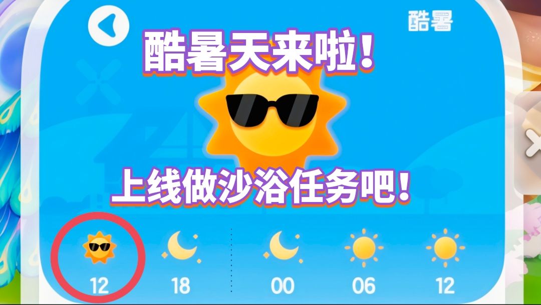 酷暑天来啦,今天中午12点到晚上6点,酷暑天。 沙浴任务还没完成的朋友,记得上线做任务哦[表情_比心]。 本周四和周五也有酷暑天,大家到时候可以看着时间去参加。 附上 酷暑天沙浴 攻略:晒伤腮红脸饰 晒红皮肤返场! https://www.taptap.cn/moment/695968860766995277?share_id=31dfe06a3250&utm_medium=share&utm_s