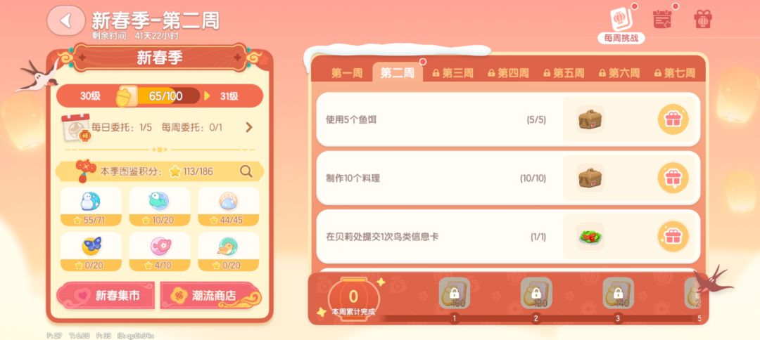 1、本周任务: 体验本周任意的新的新春活动:鞭炮虫或金鸿鱼潮. 上线即可在邮件内领取一千金币、牡丹花种子和黄色的年礼组合。 本周任务奖励:20个满愿星 本周开启的潮流活动:【金鸿鱼潮】、【舶来种子】以及【新春音乐会】 2、【舶来种子 — 牡丹种植】: 可以在【布兰克】园艺商店购买牡丹种子进行种植 3、【金鸿鱼潮】: 在鱼潮里,可以钓到特产鱼【黄金锦鲤】 4、【新春鞭炮虫】: 3种可解锁