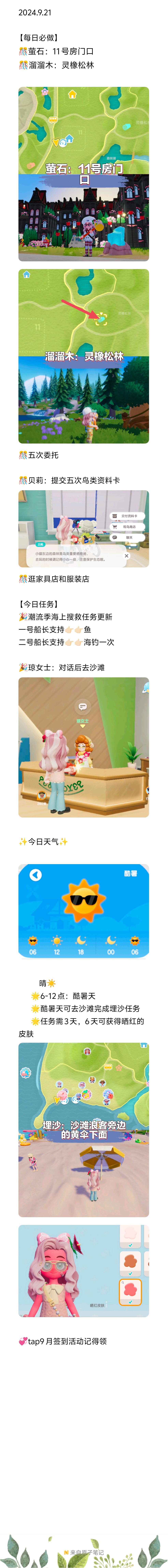 2024.9.21 【每日必做】 🎊萤石:11号房门口 🎊溜溜木:灵橡松林 🎊五次委托 🎊贝莉:提交五次鸟类观察卡 🎊逛家具店和服装店 【今日任务】 🎉潮流季海上搜救任务更新 一号船长支持👉🏻👉🏻鱼 二号船长支持👉🏻👉🏻海钓一次 🎉琼女士:对话后去沙滩 ✨今日天气✨ 晴☀️ 🌟6-12点:酷暑天 🌟酷暑天可去沙滩完成埋沙任务 🌟任务需3天,6天可获得晒红的皮肤 💞tap9月签到活动