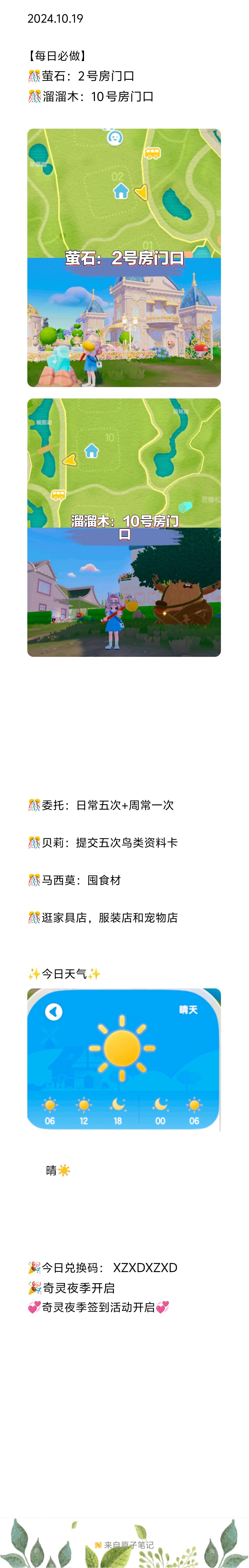 2024.10.19 【每日必做】 🎊萤石:2号房门口 🎊溜溜木:10号房门口 🎊委托:日常五次+周常一次 🎊贝莉:提交五次鸟类资料卡 🎊马西莫:囤食材 🎊逛家具店,服装店和宠物店 ✨今日天气✨ 晴☀️ 🎉今日兑换码: XZXDXZXD 🎉奇灵夜季开启 💞奇灵夜季签到活动开启💞 #心动小镇 #心动小镇攻略