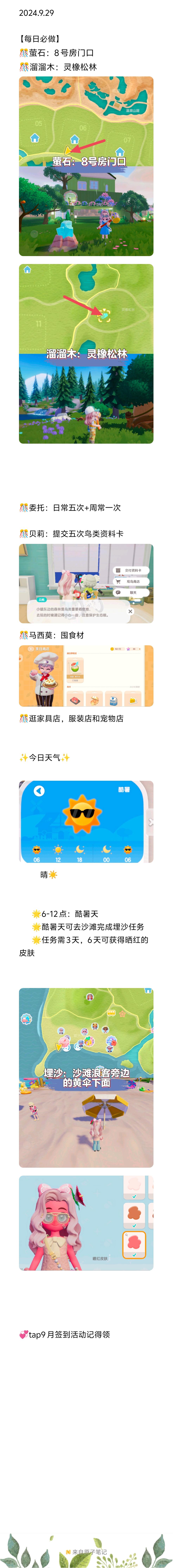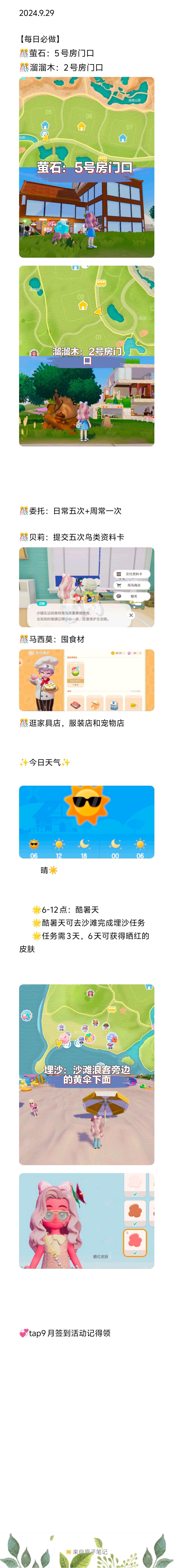 2024.9.30 【每日必做】 🎊萤石:5号房门口 🎊溜溜木:2号房门口 🎊委托:日常五次+周常一次 🎊贝莉:提交五次鸟类资料卡 🎊马西莫:囤食材 🎊逛家具店,服装店和宠物店 ✨今日天气✨ 晴☀️ 🌟6-12点:酷暑天 🌟酷暑天可去沙滩完成埋沙任务 🌟任务需3天,6天可获得晒红的皮肤 💞tap9月签到活动记得领 #心动小镇 #心动小镇攻略