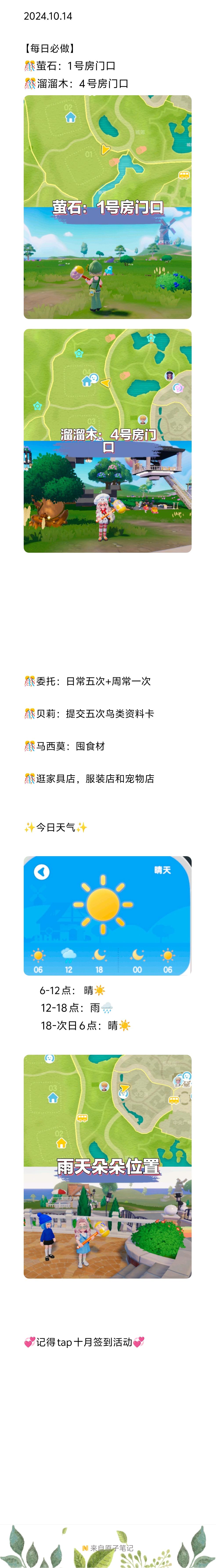 2024.10.14 【每日必做】 🎊萤石:1号房门口 🎊溜溜木:4号房门口 🎊委托:日常五次+周常一次 🎊贝莉:提交五次鸟类资料卡 🎊马西莫:囤食材 🎊逛家具店,服装店和宠物店 ✨今日天气✨ 6-12点: 晴☀️ 12-18点:雨🌧️ 18-次日6点:晴☀️ 💞记得tap十月签到活动💞 #心动小镇 #心动小镇攻略