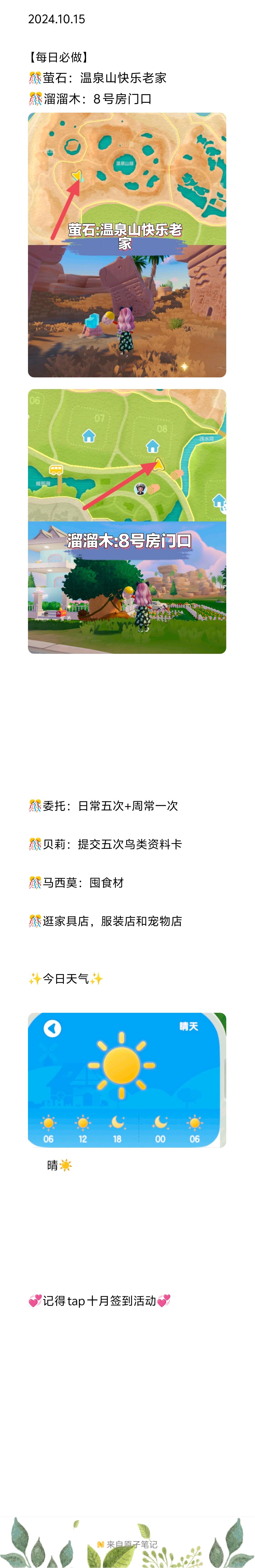 2024.10.15 【每日必做】 🎊萤石:温泉山快乐老家 🎊溜溜木:8号房门口 🎊委托:日常五次+周常一次 🎊贝莉:提交五次鸟类资料卡 🎊马西莫:囤食材 🎊逛家具店,服装店和宠物店 ✨今日天气✨ 晴☀️ 💞记得tap十月签到活动💞 #心动小镇 #心动小镇攻略