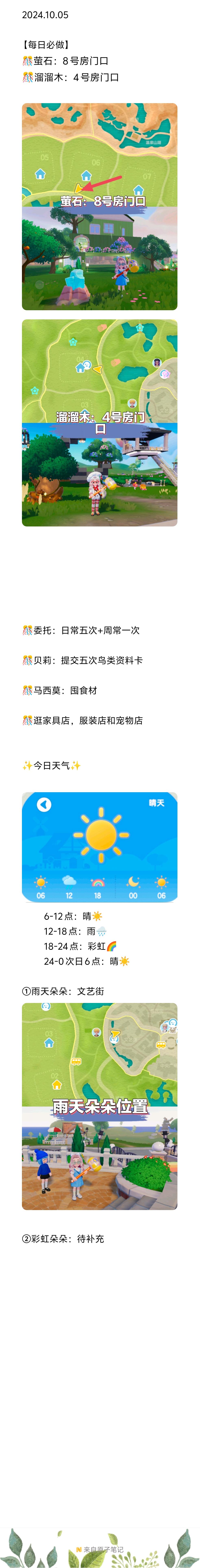 2024.10.05 【每日必做】 🎊萤石:8号房门口 🎊溜溜木:4号房门口 🎊委托:日常五次+周常一次 🎊贝莉:提交五次鸟类资料卡 🎊马西莫:囤食材 🎊逛家具店,服装店和宠物店 ✨今日天气✨ 6-12点:晴☀️ 12-18点:雨🌧️ 18-24点:彩虹🌈 24-0次日6点:晴☀️ ①雨天朵朵:文艺街 ②彩虹朵朵:花田 彩虹天1:花田 https://www.taptap.cn/momen