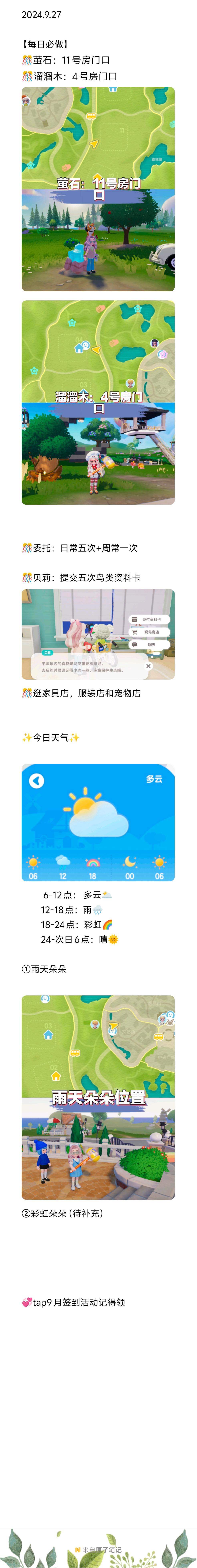 2024.9.27 【每日必做】 🎊萤石:11号房门口 🎊溜溜木:4号房门口 🎊委托:日常五次+周常一次 🎊贝莉:提交五次鸟类资料卡 🎊逛家具店,服装店和宠物店 ✨今日天气✨ 6-12点: 多云🌥️ 12-18点:雨🌧️ 18-24点:彩虹🌈 24-次日6点:晴🌞 ①雨天朵朵:文艺街 ②彩虹日攻略:【彩虹日】彩虹朵朵及彩虹花位置4 https://www.taptap.cn/momen
