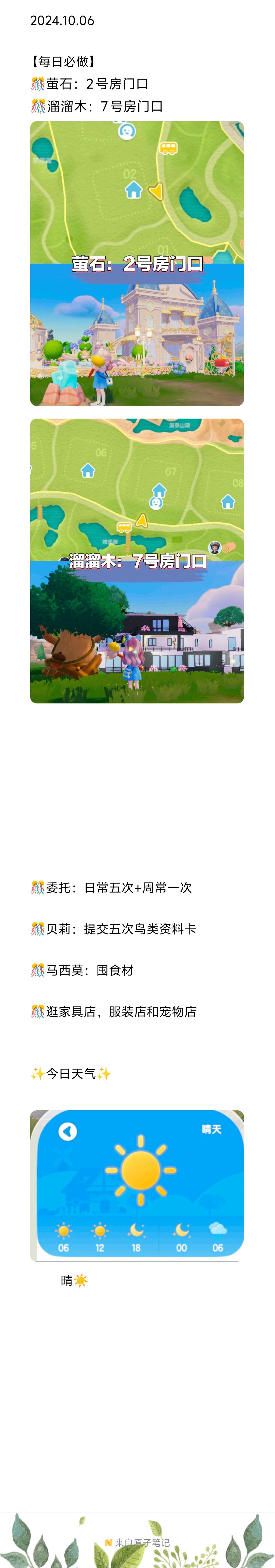 2024.10.06 【每日必做】 🎊萤石:2号房门口 🎊溜溜木:7号房门口 🎊委托:日常五次+周常一次 🎊贝莉:提交五次鸟类资料卡 🎊马西莫:囤食材 🎊逛家具店,服装店和宠物店 ✨今日天气✨ 晴☀️ #心动小镇 #心动小镇攻略