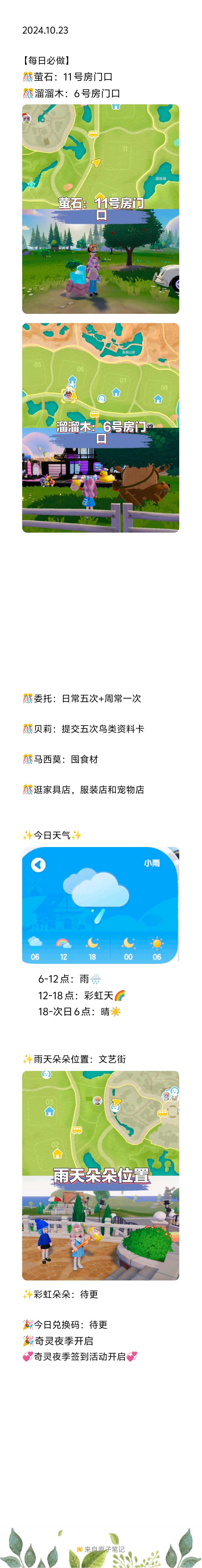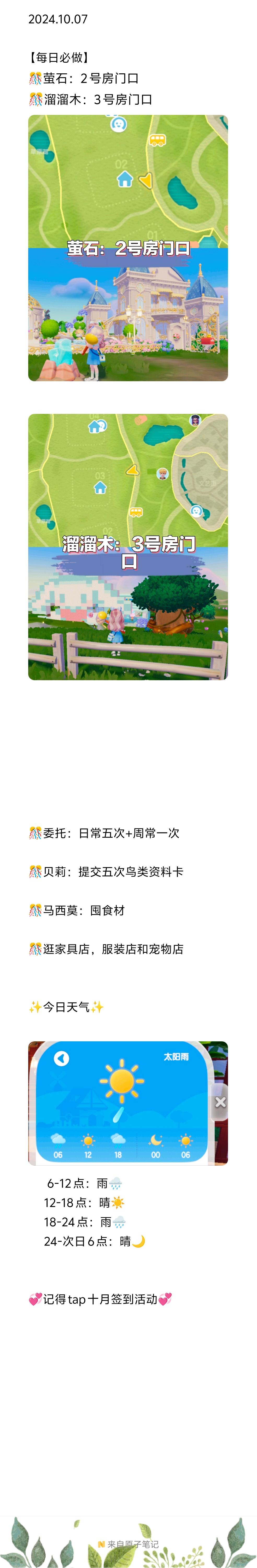2024.10.07 【每日必做】 🎊萤石:2号房门口 🎊溜溜木:3号房门口 🎊委托:日常五次+周常一次 🎊贝莉:提交五次鸟类资料卡 🎊马西莫:囤食材 🎊逛家具店,服装店和宠物店 ✨今日天气✨ 6-12点:雨🌧️ 12-18点:晴☀️ 18-24点:雨🌧️ 24-次日6点:晴🌙 💞记得tap十月签到活动💞 #心动小镇 #心动小镇攻略
