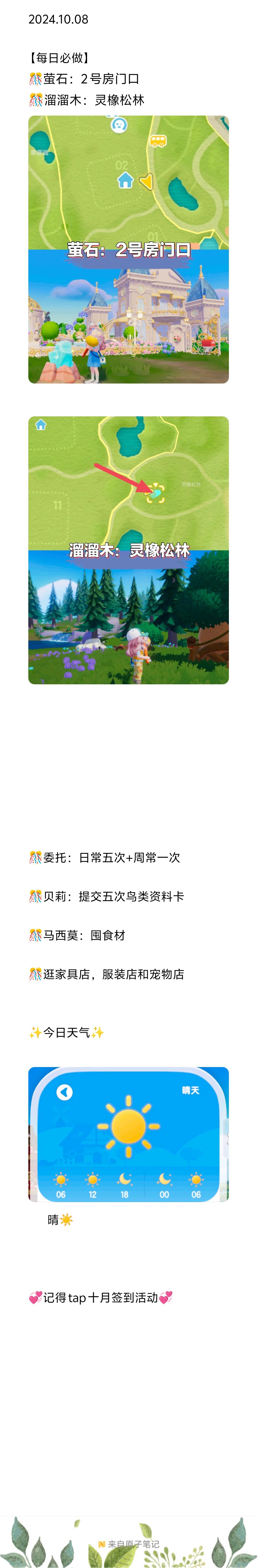 2024.10.08 【每日必做】 🎊萤石:2号房门口 🎊溜溜木:灵橡松林 🎊委托:日常五次+周常一次 🎊贝莉:提交五次鸟类资料卡 🎊马西莫:囤食材 🎊逛家具店,服装店和宠物店 ✨今日天气✨ 晴☀️ 💞记得tap十月签到活动💞 #心动小镇 #心动小镇攻略