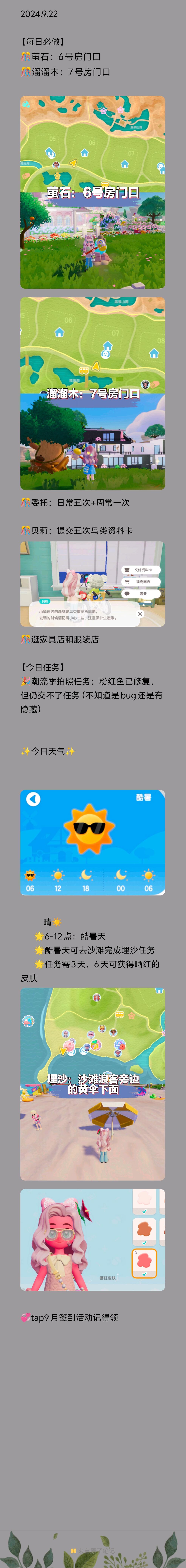 2024.9.22 【每日必做】 🎊萤石:6号房门口 🎊溜溜木:7号房门口 🎊委托:日常五次+周常一次 🎊贝莉:提交五次鸟类资料卡(宠物店二楼) 🎊逛家具店,服装店 宠物店 【今日任务】 🎉潮流季拍照任务:粉红鱼已修复,但仍交不了任务(不知道是bug还是有隐藏) ✨今日天气✨ 晴☀️ 🌟6-12点:酷暑天 🌟酷暑天可去沙滩完成埋沙任务 🌟任务需3天,6天可获得晒红的皮肤 💞tap9