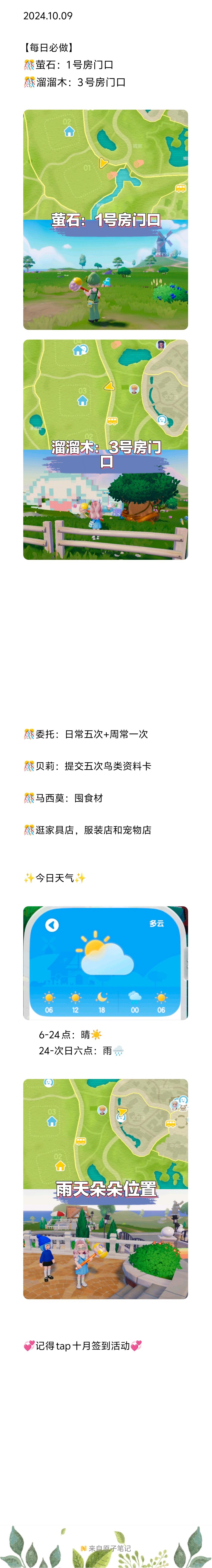 2024.10.09 【每日必做】 🎊萤石:1号房门口 🎊溜溜木:3号房门口 🎊委托:日常五次+周常一次 🎊贝莉:提交五次鸟类资料卡 🎊马西莫:囤食材 🎊逛家具店,服装店和宠物店 ✨今日天气✨ 6-24点:晴☀️ 24-次日六点:雨🌧️ 💞记得tap十月签到活动💞 #心动小镇 #心动小镇攻略