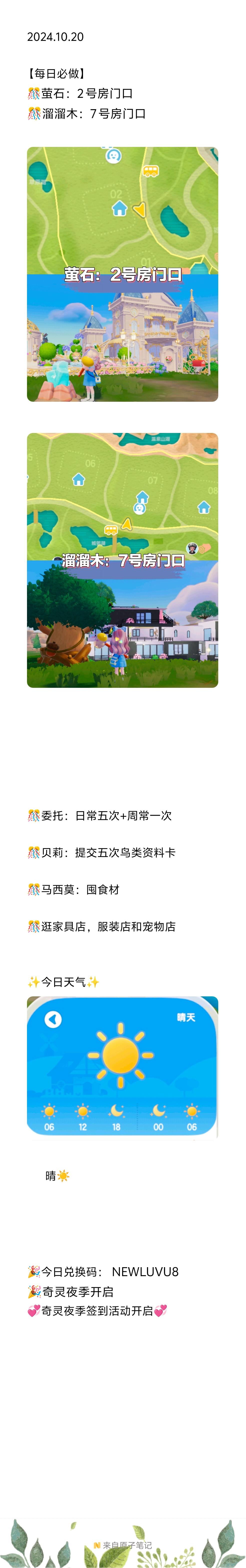 2024.10.20 【每日必做】 🎊萤石:2号房门口 🎊溜溜木:7号房门口 🎊委托:日常五次+周常一次 🎊贝莉:提交五次鸟类资料卡 🎊马西莫:囤食材 🎊逛家具店,服装店和宠物店 ✨今日天气✨ 晴☀️ 🎉今日兑换码: NEWLUVU8 🎉奇灵夜季开启 💞奇灵夜季签到活动开启💞 #心动小镇 #心动小镇攻略